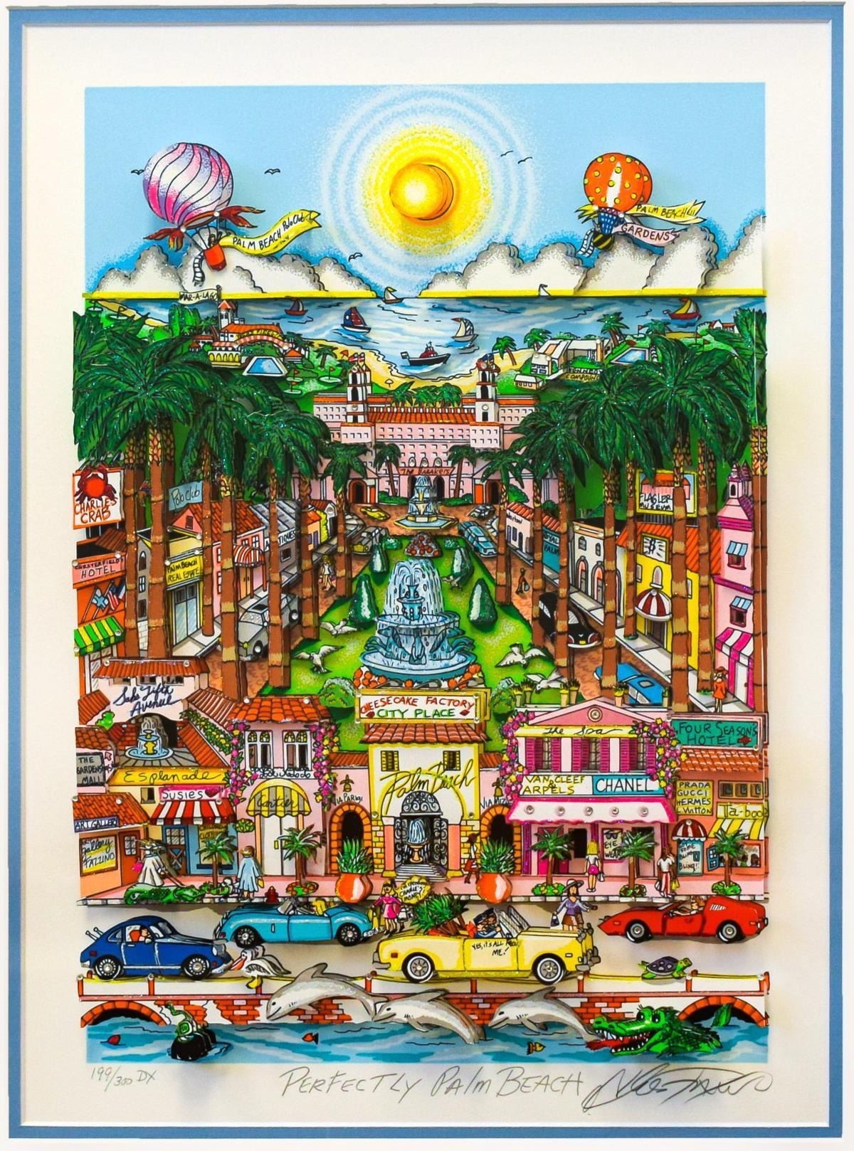 Artist: Charles Fazzino. Medium: 3D Construction Silkscreen Serigraph. Title: Perfectly Palm Beach. Size (Unframed): 17" x 12". Size (Framed): 25.5" x 21". Limited Edition: Edition of 300 DX. Certificate of Authenticity: From the publisher. Additional: Custom framed. Reference# 14325.