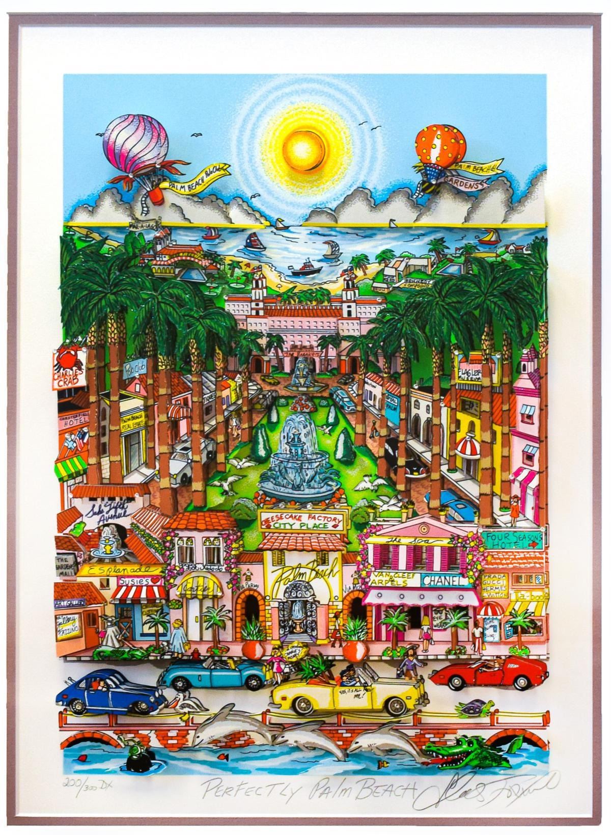 Artist: Charles Fazzino. Medium: 3D Construction Silkscreen Serigraph. Title: Perfectly Palm Beach. Size (Unframed): 17" x 12". Measures approx. (Framed): 25.5" x 21". Limited Edition: Edition of 300 DX. Certificate of Authenticity: From the publisher. Additional: Custom framed. Reference# 14264.