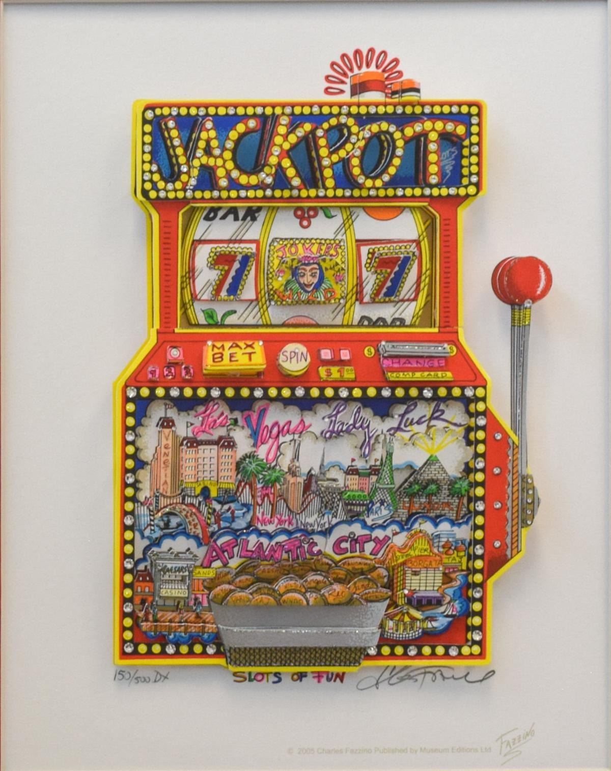 Artist: Charles Fazzino. Medium: 3D Construction Silkscreen Serigraph. Title: Slots of Fun. Size (Unframed): 12" x 10". Size (Framed): 22.5" x 20". Limited Edition: Edition of 500DX. Certificate of Authenticity: From the publisher. Additional: Custom Framed. Reference# 11187.
