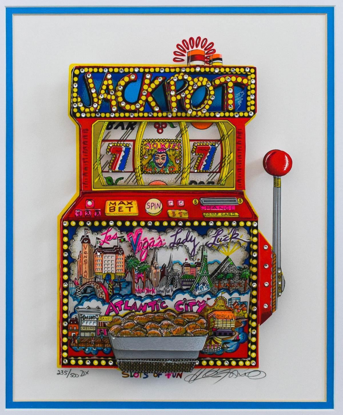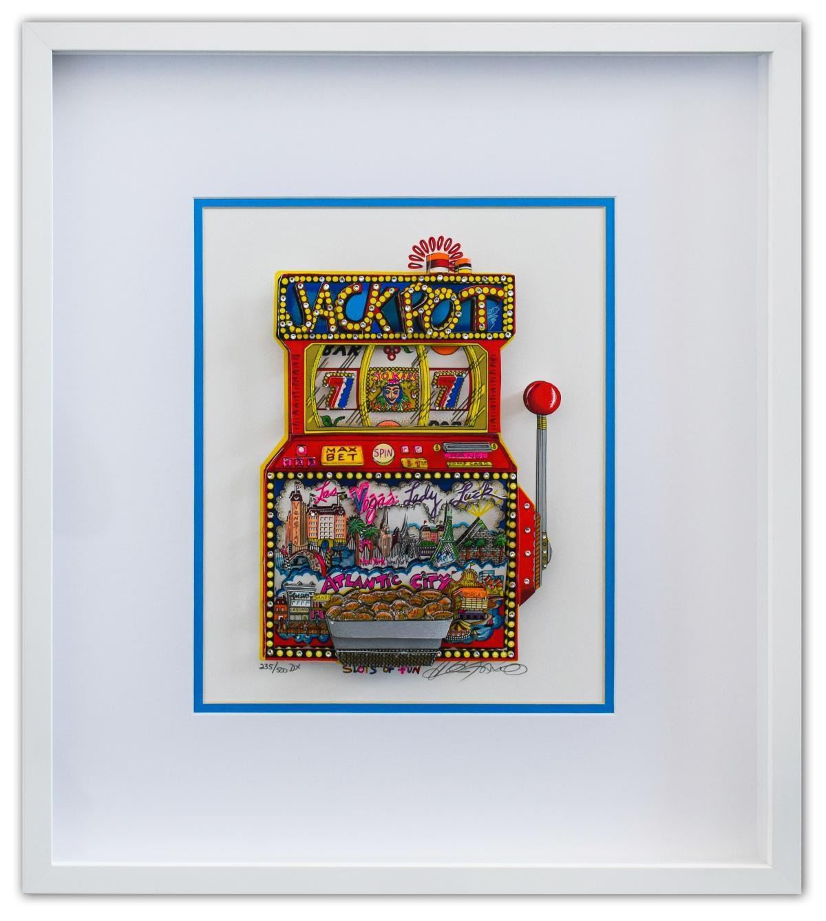 Artist: Charles Fazzino. Medium: 3D Construction Silkscreen Serigraph. Title: Slots of Fun. Size (Unframed): 12" x 10". Size (Framed): 21.5" x 19". Limited Edition: Edition of 500 DX. Certificate of Authenticity: From the publisher. Additional: Custom Framed. Reference# 13495.