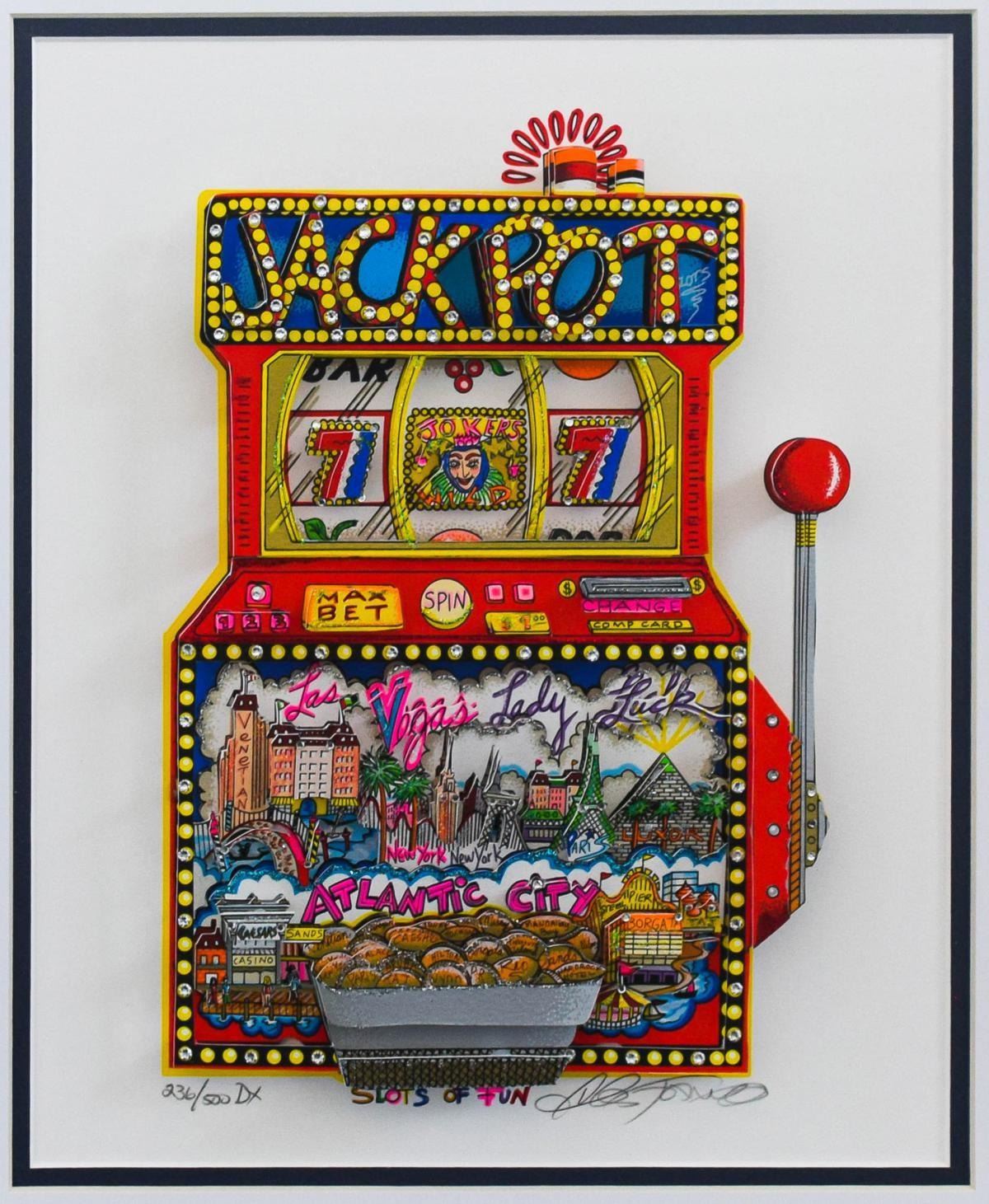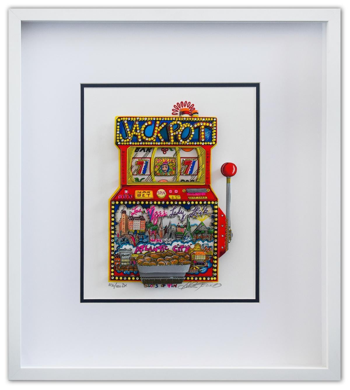 Artist: Charles Fazzino. Medium: 3D Construction Silkscreen Serigraph. Title: Slots of Fun. Size (Unframed): 12" x 10". Size (Framed): 21.5" x 19". Limited Edition: Edition of 500 DX. Certificate of Authenticity: From the publisher. Additional: Custom Framed. Reference# 13494.