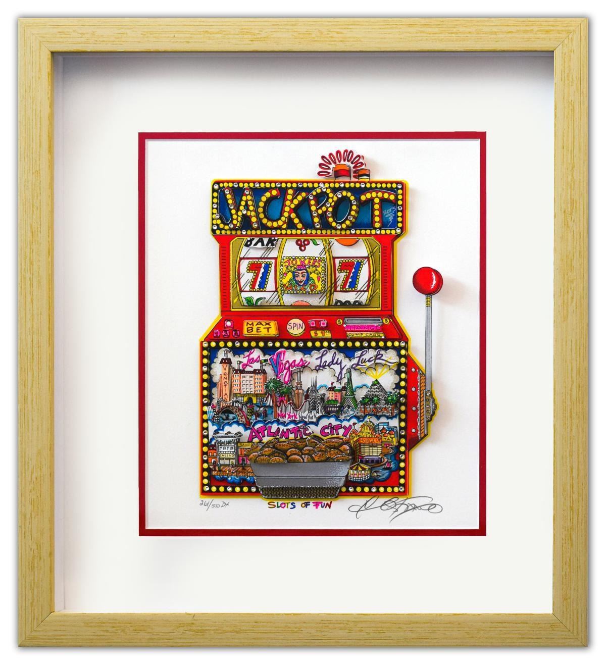 Artist: Charles Fazzino. Medium: 3D Construction Silkscreen Serigraph. Title: Slots of Fun. Size (Unframed): 12" x 10". Size (Framed): 21.5" x 19". Limited Edition: Edition of 500 DX. Certificate of Authenticity: From the publisher. Additional: Custom framed. Reference# 14252.