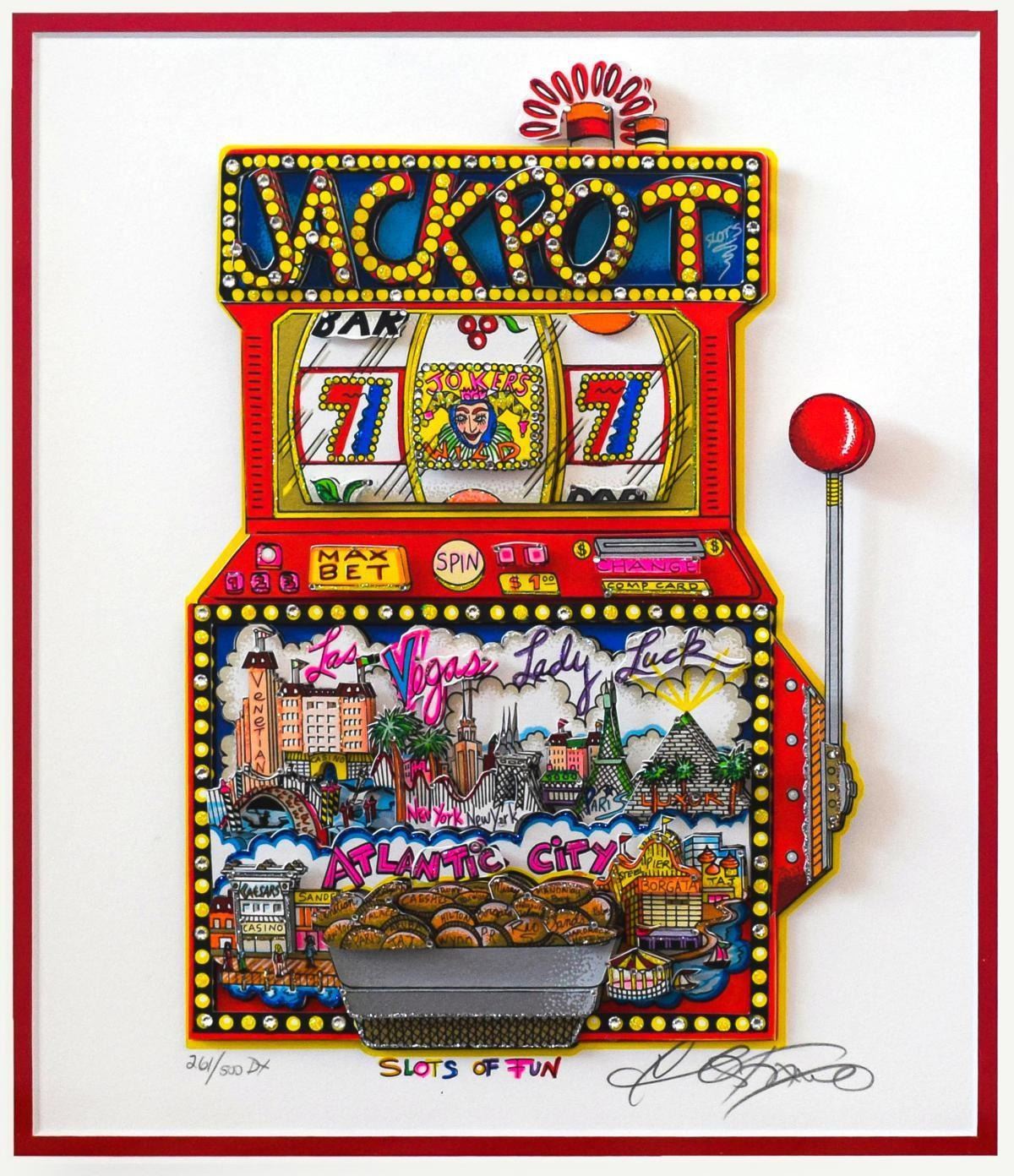 Artist: Charles Fazzino. Medium: 3D Construction Silkscreen Serigraph. Title: Slots of Fun. Size (Unframed): 12" x 10". Size (Framed): 21.5" x 19". Limited Edition: Edition of 500 DX. Certificate of Authenticity: From the publisher. Additional: Custom framed. Reference# 14252.