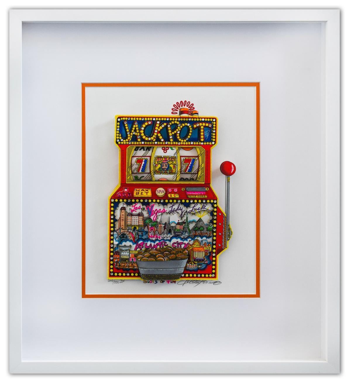 Artist: Charles Fazzino. Medium: 3D Construction Silkscreen Serigraph. Title: Slots of Fun. Size (Unframed): 12" x 10". Size (Framed): 21.5" x 19". Limited Edition: Edition of 500 DX. Certificate of Authenticity: From the publisher. Additional: Custom Framed. Reference# 13501.