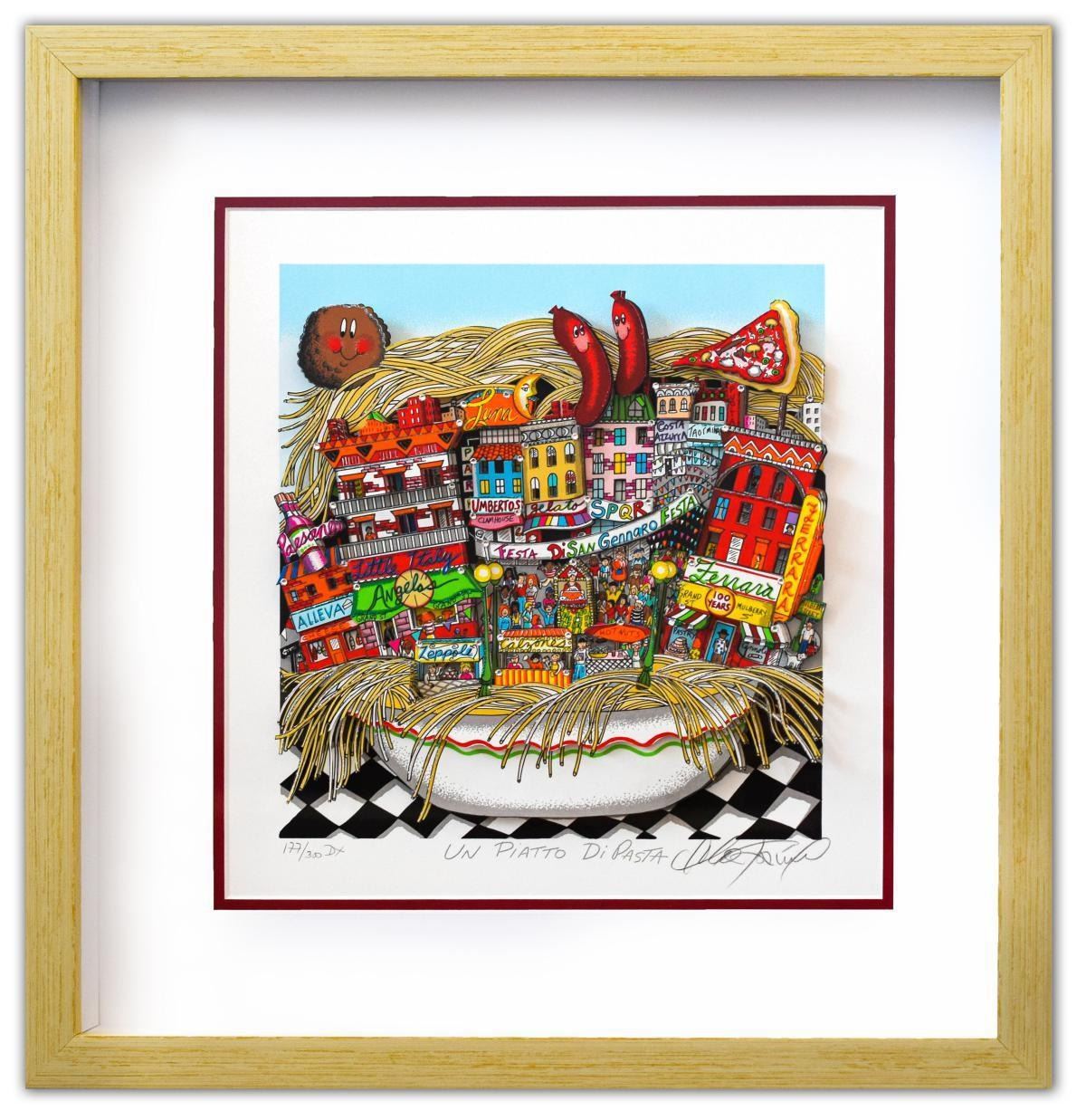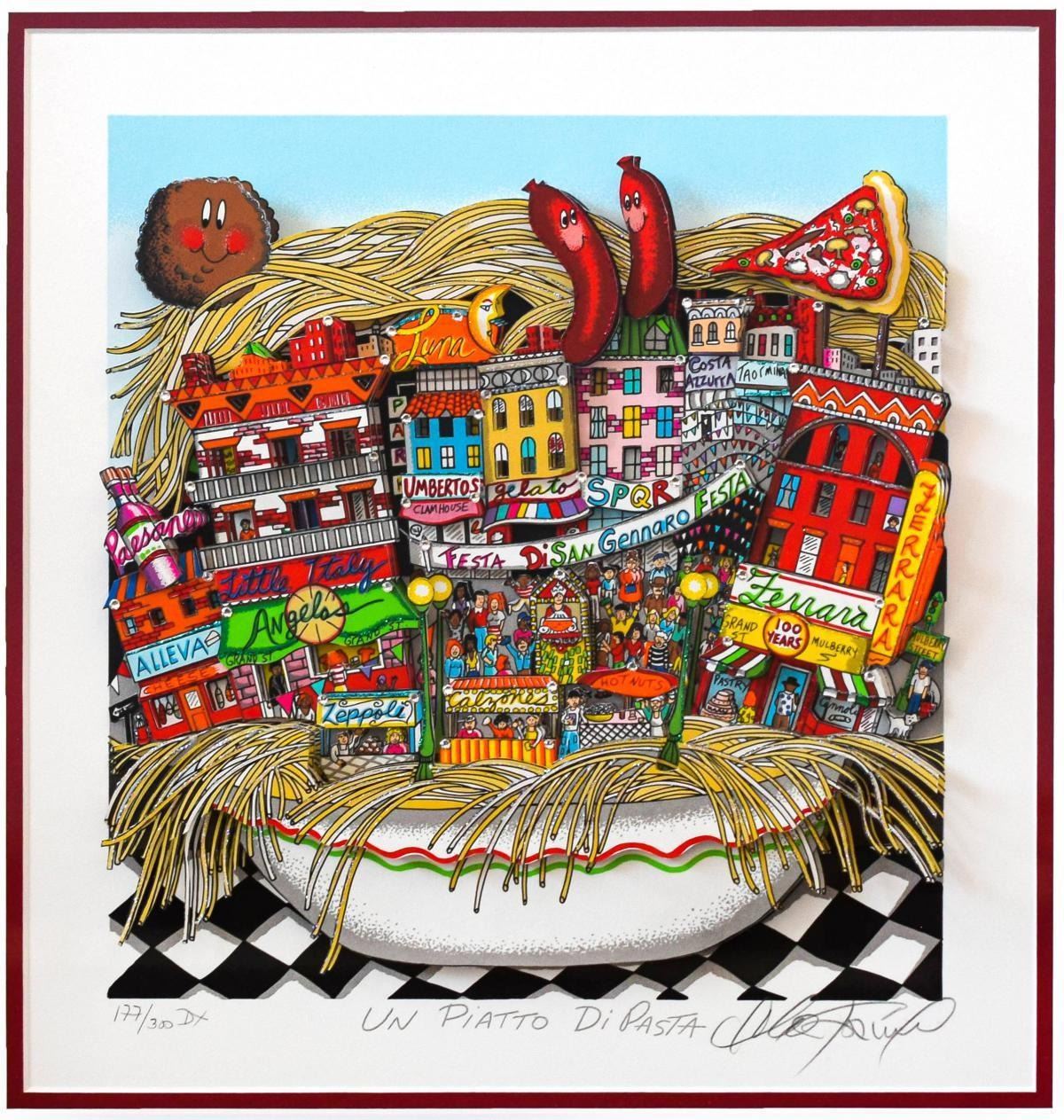 Artist: Charles Fazzino. Medium: 3D Construction Silkscreen Serigraph. Title: Un Piatto Di Pasta. Size (Unframed): 9" x 9". Size (Framed): 15" x 15". Limited Edition: Edition of 300 DX. Certificate of Authenticity: From the publisher. Additional: Custom framed. Reference# 14259.