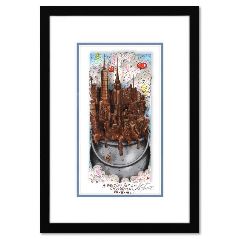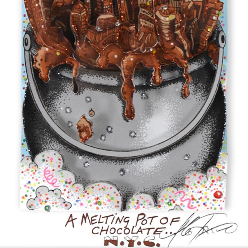 "A Melting Pot of Chocolate...NYC" is a 3D limited edition silk screen construct on paper by Charles Fazzino, DX numbered 70/100 and hand signed by the artist. This piece comes custom framed. Includes Certificate of Authenticity. Measures approximately 12.5" x 18.5" (frame), 5" x 10" (image).