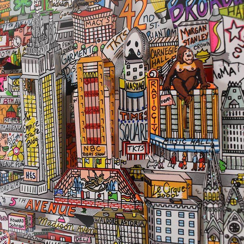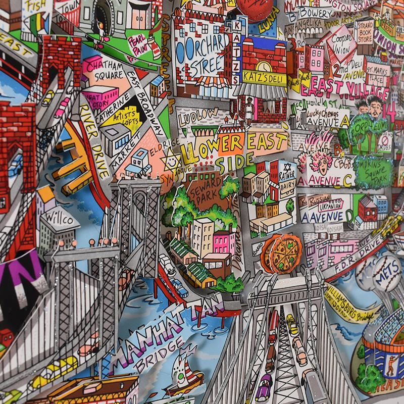 "NY Is" is a 3D limited edition silk screen construct on paper by Charles Fazzino, numbered 291/500 and hand signed by the artist. This piece comes custom framed. Includes Certificate of Authenticity. Measures approximately 49.5" x 28.5" (frame), 40" x 20" (image).