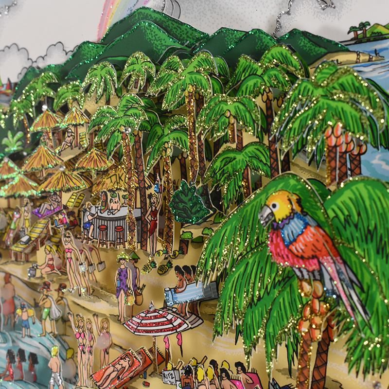 "Our Caribbean Vacation" is a 3D limited edition silk screen construct on paper by Charles Fazzino, DX numbered 117/350 and hand signed by the artist. This piece comes custom framed. Includes Certificate of Authenticity. Measures approximately 20.5" x 17.5" (framed), 12.5" x 9" (image).