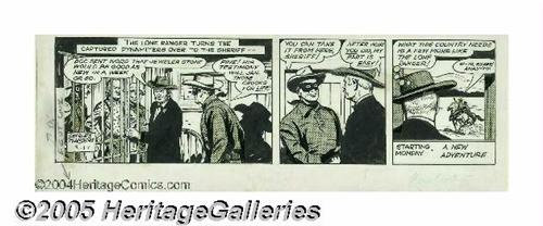 <B>Charles Flanders - Lone Ranger Daily Comic Strip Original Art (King Features Syndicate, undated).</B></I> The Lone Ranger turns some captured dynamiters over to the town sheriff, and hightails it out into the desert, along with Tonto, in this daily <I>Lone Ranger</B></I> comic strip. The art is dated 3-17 (year unidentified), and the artist is the well known Charles Flanders, who worked on the strip from 1939 to 1971. The art measures 6.75" x 19" and has a 5" x 18" image area. The Zipatone film in all three panels has yellowed; otherwise the art is in Excellent condition. Heigh ho, Silver! And away!