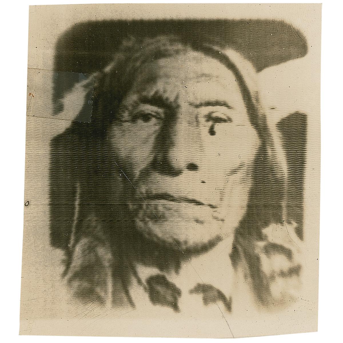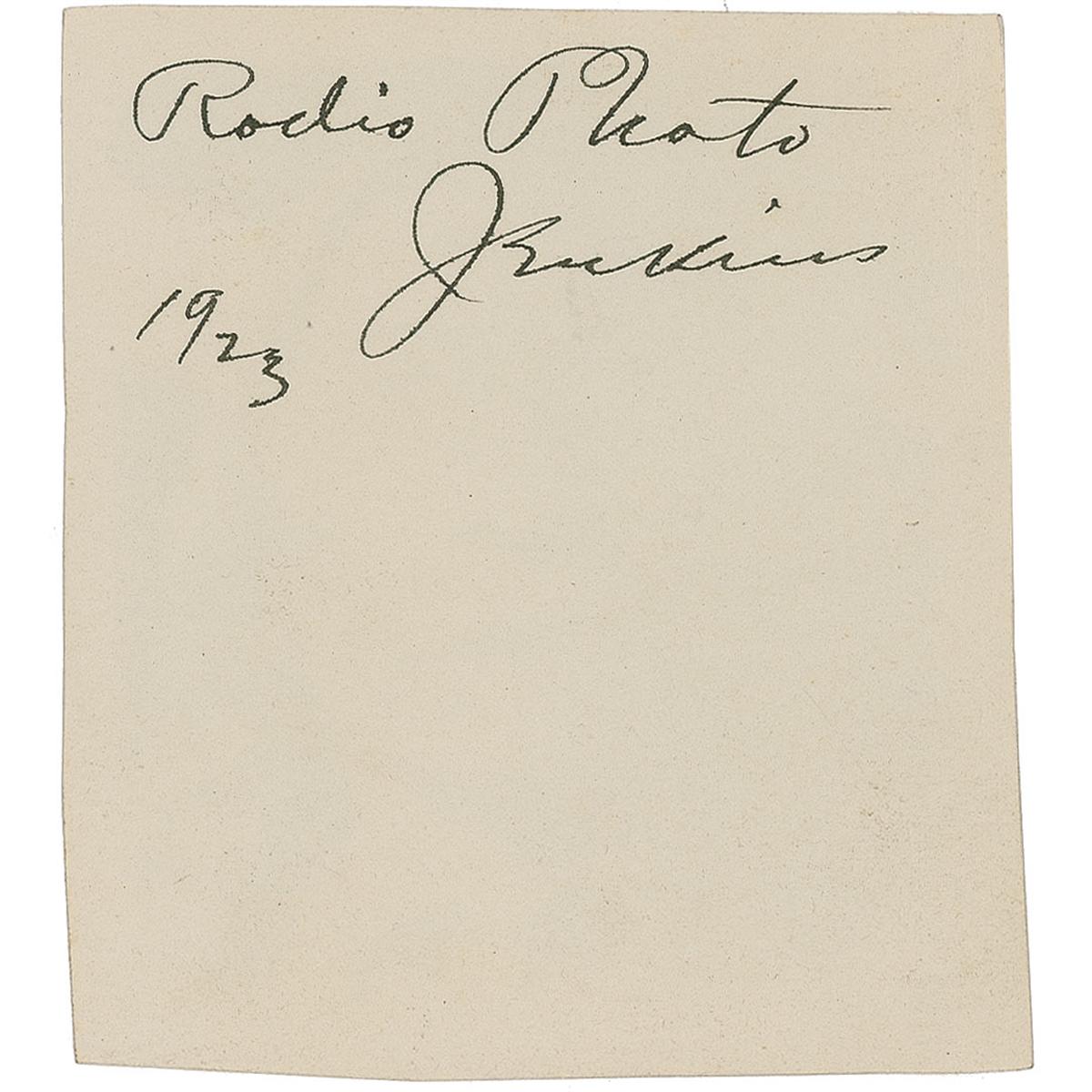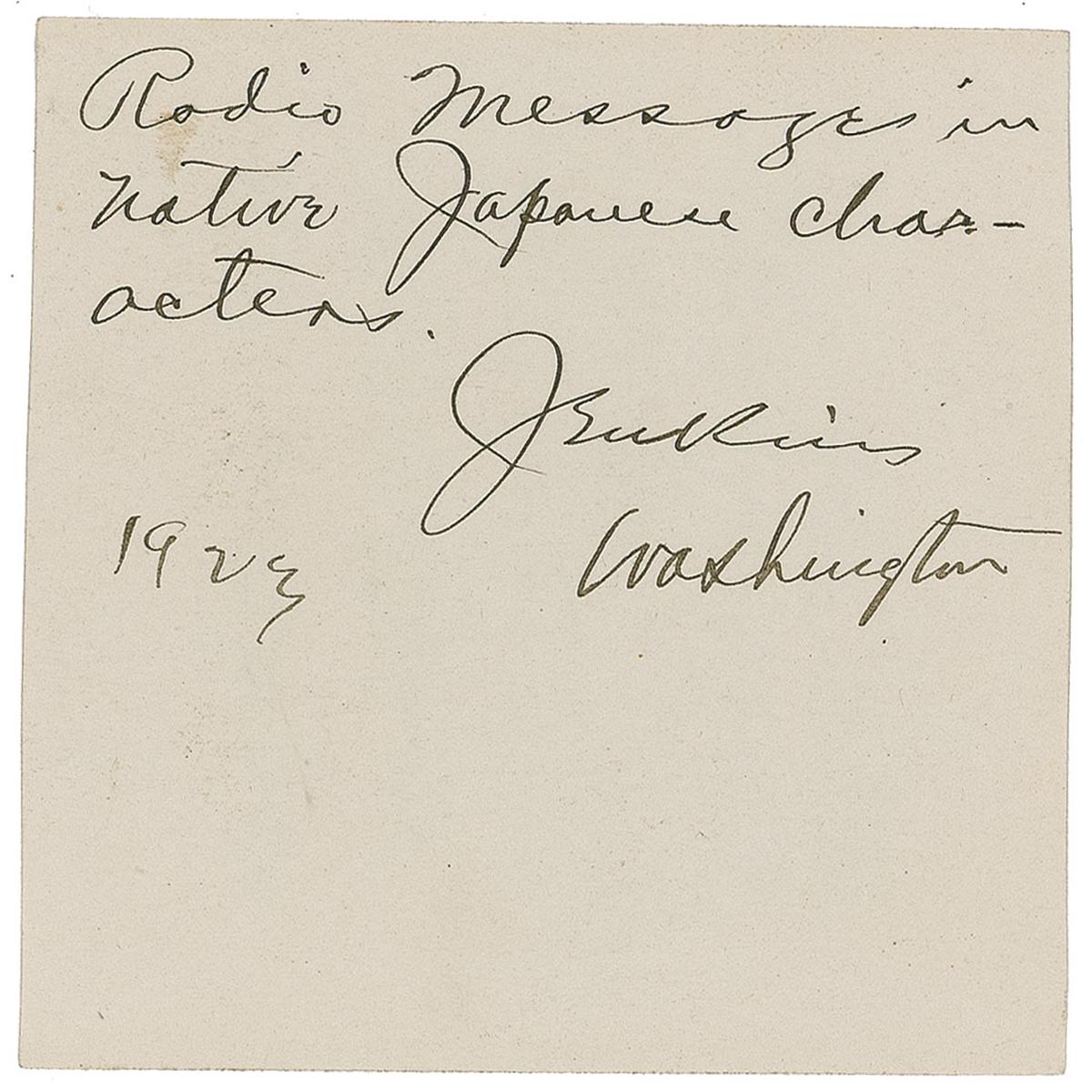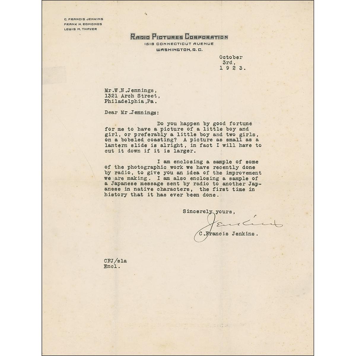 Early cinema and television pioneer (1867–1934). TLS signed “Jenkins,” one page, 8.5 x 11, Radio Pictures Corporation letterhead, October 3, 1923. Jenkins writes to photographer William N. Jennings. In full: “Do you happen by good fortune for me to have a picture of a little boy and girl, or preferably a little boy and two girls, on a bobsled coasting? A picture as small as a lantern slide is alright [sic]. In fact I will have to cut it down if it is larger. I am enclosing a sample of some of the photographic work we have recently done by radio, to give you an idea of the improvement we are making. I am also enclosing a sample of a Japanese message sent by radio to another Japanese in native characters, the first time in history that it has ever been done.” In fine condition, with intersecting folds, one passing through his name, and light toning and soiling. Accompanied by the two photos mentioned in the letter, a glossy 3.5 x 3.5 image of a Native American, signed on the reverse, “Radio photo Jenkins 1923,” and a glossy 3.5 x 3.5 photo of Japanese characters, signed on the reverse, “Radio messages in native Japanese characters, Jenkins Washington 1923.” These early photos were among the very first sent by radio wave.