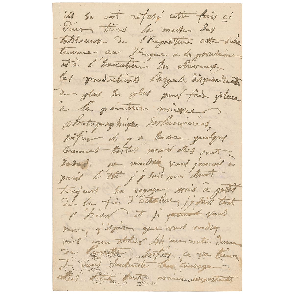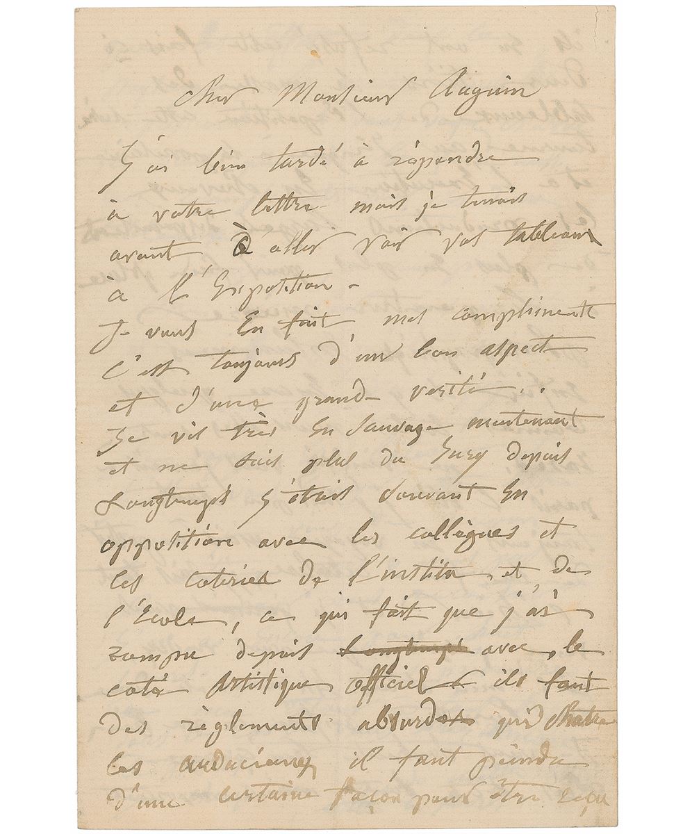 Painter of the Barbizon school considered an important precursor of Impressionism (1817–1878). ALS in French, signed “C. Daubigny,” three pages on two adjoining sheets, 5.25 x 8, no date. Letter to painter Louis-Augustin Auguin, offering compliments for his two paintings and continuing (translated): “I am very wild and am now no longer on the panel. I was often in conflict with colleagues and cliques of the institute and the school, so that I broke…with the official artistic side. They are absurd regulations castrating the bold. It must be painted in a way to be received. They opposed this time…the bulk of the paintings in the exhibition…well there are still some good paintings but they are rare.” Several lines in another hand have been penned at the conclusion. In fine condition, with central vertical and horizontal folds, a small tear to the upper right corner, and light show-through from writing to opposing sides. This letter may refer to Daubigny’s tumultuous relationship with the Salon, where he first served as a juror in 1865 but resigned in protest when Pissarro and Cezanne’s works were rejected. This pattern would continue throughout the years—he resigned again in 1870 after one of Monet’s submissions was declined, and did the same in 1875 after becoming frustrated with the Salon jury’s rigid standards. Excellent content from one painter to another, remarking on his own artistic taste and touching upon the infighting in the French artistic world.