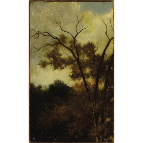 <B>CHARLES FRANÇOIS DAUBIGNY </B></I>(French, 1817-1878)<BR><I>Woodland Landscape</B></I>, 1850<BR>Oil on canvas laid on board<BR>14-1/2 x 8-3/4 inches (36.8 x 22.1 cm)<BR>Signed and dated lower left<I>: C. Daubigny 1850</B></I><BR>Wax seal on verso <B>Condition Report:</B> Minor craquelure throughout sky, surface grime<BR><BR><b>Shipping:</b> Requires 3rd Party Shipping (<a target="_blank" href="http://www.heritageauctions.com/common/shipping.php">view shipping information</a>)