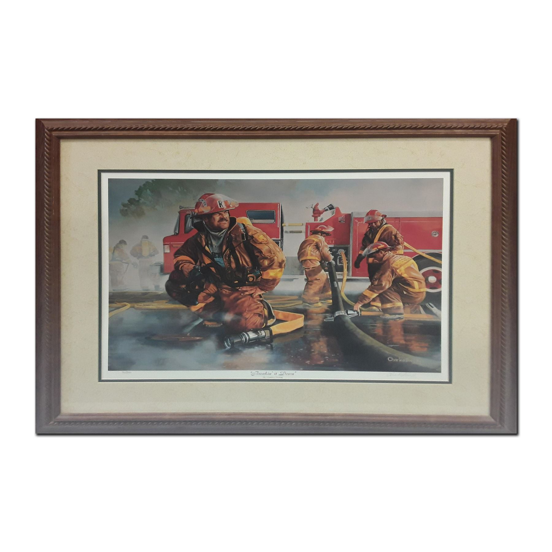 Charles Freitag's "Breakin' It Down" limited edition print signed and numbered 923/950. This has been custom framed and matted using acid free matting. This print is of six firemen and a firetruck. Image- 16 1/2" x 24". Frame- 28 1/2" x 35 1/4".