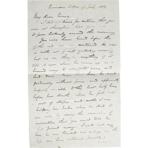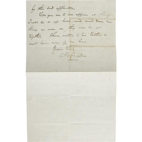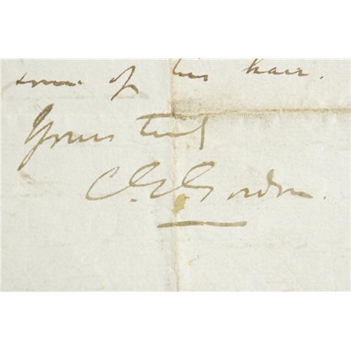 <B>Charles G. "Chinese" Gordon Autograph Letter Signed</B></I> "<I>C.G. Gordon</B></I>". One page, 7.75" x 12.25", Quinsan, July 17, 1863. The letter was written on July 17, 1863 in Quinsan during Gordon's campaign against the Taipings reporting the death of a fellow officer and asking Ewing to wind up his affairs in Shanghai. It reads: "<I>He was a little out of sorts yesterday morning but no one thought anything of it till 12 noon when he came up in a hurried way to Moffit's room and laid down. From that hour he sank gradually without pain, and apparently perfectly sensible to the last half hour before his death, when he fell into a sort of stupor, and although I was holding his pulse when he died it was only by seeing the cessation of respiration that you could tell he had passed away . . .</B></I>" In 1860, Gordon was posted to China as part of the Allied Expeditionary Force that was fighting the 2nd Opium War. Once peace was made with the Chinese Emperor, Gordon was appointed as the Commander of the 'Ever Victorious Army', a force of mercenaries that was led by European Officers. The EVA was trying to suppress the Taiping rebellion; this was a rebellion against the Manchus led by a 'messiah' who was trying to set up "God's kingdom on Earth". Gordon injected discipline and "steel" into the force. The EVA became a feared force and was instrumental in ending the rebellion. Gordon led the EVA into battle from the front carrying only a walking stick. When Gordon refused to allow the EVA to loot captured cities as the Manchus allowed, the EVA mutinied. Gordon suppressed the mutiny by first shooting dead one of the ringleaders and then threatening to shoot one of the mutineers an hour until the mutiny was over. It was over inside the hour. Soochow was captured by the EVA in 1864 after the Taipings surrendered to Gordon when he offered them safe conduct. Gordon was away on business when theManchus had the Wangs, the leaders of the Taipings, executed. Gordon was furious and promptly resigned his command. He only returned after being implored by the British and promoted to the rank of Mandarin in the Chinese army. He refused an offer of 100,000 gold pieces by the emperor. This reinforced Gordon's reputation as being incorruptible. Gordon became known as 'Chinese Gordon' in England. The British rewarded him with a promotion to Lieutenant Colonel and he became a Companion of Honor. A scarce and representative letter from the legendary symbol of the zenith of the British Empire. Fine condition.