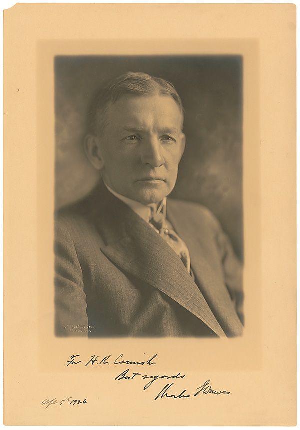 Vice president under Calvin Coolidge (1865–1951) and co-winner of the 1925 Nobel Peace Prize for the Dawes Plan for World War I reparations. Dignified vintage matte-finish 9.5 x 13.5 Harris & Ewing portrait, signed and inscribed in the lower border in fountain pen “For H. R. Cornish, Best regards, Charles G. Dawes, Apr. 5th 1926.” Scattered marks to the finish, a central block of toning over the photo and inscription, and light paper loss to the upper left corner, which can easily be matted out, otherwise fine condition.