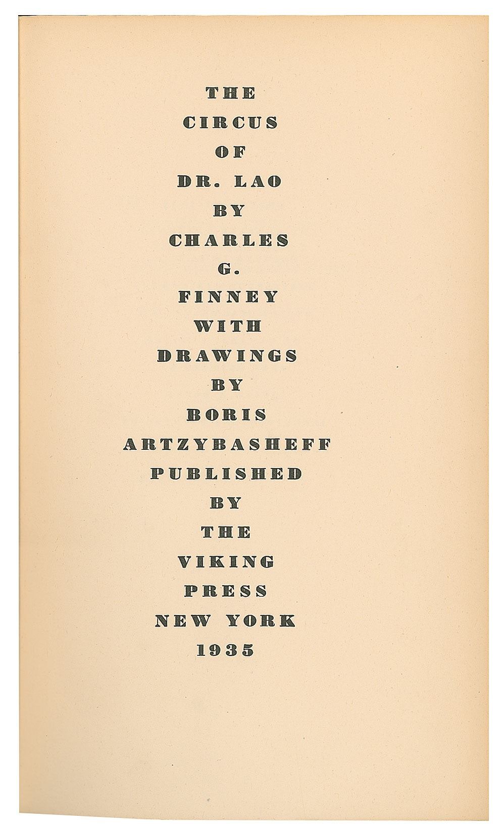 Unsigned first edition book: The Circus of Dr. Lao by Charles G. Finney, with illustrations by Boris Artzybasheff. First edition. NY: Viking Press, 1934. Hardcover with dust jacket, 6 x 9.25, 154 pages. Book condition: VG+/VG, with small edge tears to dust jacket. Finney's novel won the National Book Award for the 'Most Original Book of 1935,' and was later adapted into the special effects–filled movie 7 Faces of Dr. Lao.