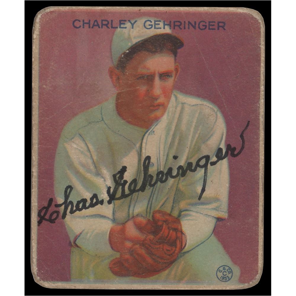 Attractive 1933 Goudey #222 Charley Gehringer baseball card, neatly signed in black felt tip by the Hall of Fame infielder, "Chas. Gehringer." In very good to fine condition, with light creases and rounded corners.