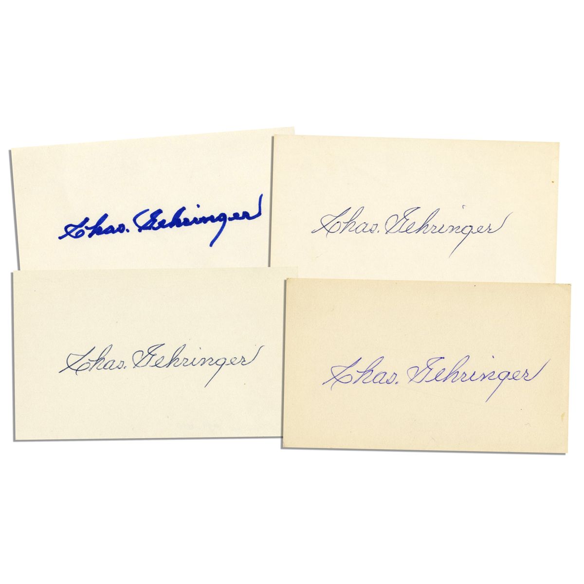Lot of Four Cards Signed by Hall of Famer Charles Gehringer -- ''The Mechanical Man'' Signs ''Chas. Gehringer'' -- 5'' x 3'' Cards Signed in Blue Ink and Blue Marker -- Near Fine