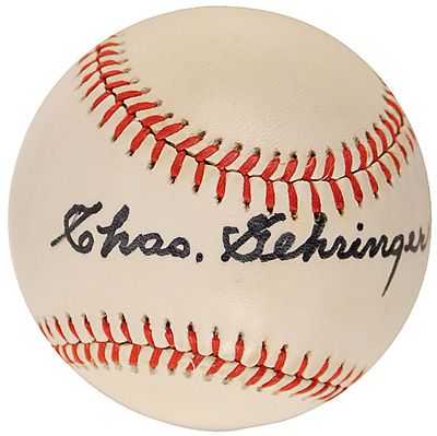 Official Rawlings American League (MacPhail) baseball signed in black felt tip on the sweet spot, “Chas. Gehringer.” In very good condition, with scattered toning to side panels.