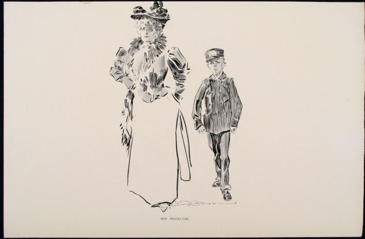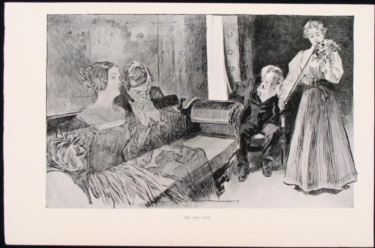 This is an original, double-sided print from the antique book Pictures of People by Charles Dana Gibson. The book and this print were published in 1896, and the edition was limited to 500 copies, many of which have probably been discarded or lost over time. It is signed on the book plate by Robert Howard Russell, the publisher for the U.S. edition. Front side: Title "THE OLD TUNE" Back side: Title "HER PROTECTOR" Artist's signature appears in the plate Sheet size: 11 3/8 x 16 3/4 inches Condition: Minor bit of surface wear at the top cornerGibson portrays both the young and old with whimsy, from the dreams of old days, to a young dreamer with big dreams. * The famous "Gibson Girl," created by Charles Dana Gibson represents the epitome of American womanhood. Aloof, independent, confident and serene in character and personality, the Gibson Girl was-first and foremost-a "stunner." She was portrayed as finely featured, her hair piled on top of her head in defiance of gravity, and always impeccably dressed. * * The illustrations of Charles Gibson both influenced and reflected the "zeitgeist" of their day. Appearing in a number of popular magazines, notably Scribner's, Harper's, Colliers and The Century Gibson's drawings were an immediate hit with the public. His images are among the first examples of popular merchandising; at the height of her popularity, the Gibson Girl appeared on china plates, umbrella stands, stick pins, wallpaper and match boxes. All of these items - but especially the illustrations themselves - are avidly sought by collectors. *