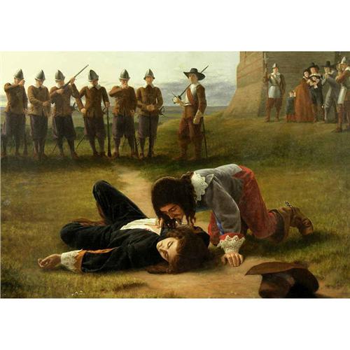 Note: Label verso -Dublin Industrial Exhibition Palace & Loan Museum of Art Treasures. Inscription verso: "True to Death' Sir George Lislow stoops to kiss the dead body of Sir Charles Lucas before being himself shot. Exhibited at