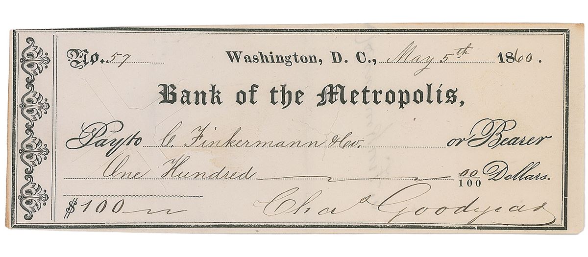 American inventor (1800–1860) whose development of the vulcanization process revolutionized the rubber industry. Bank of the Metropolis check, 6.5 x 2.5, filled out and signed by Goodyear, “Chas Goodyear,” payable to C. Finkermann for $100, May 5, 1860. In fine condition, with expected cancellation cuts to the body.