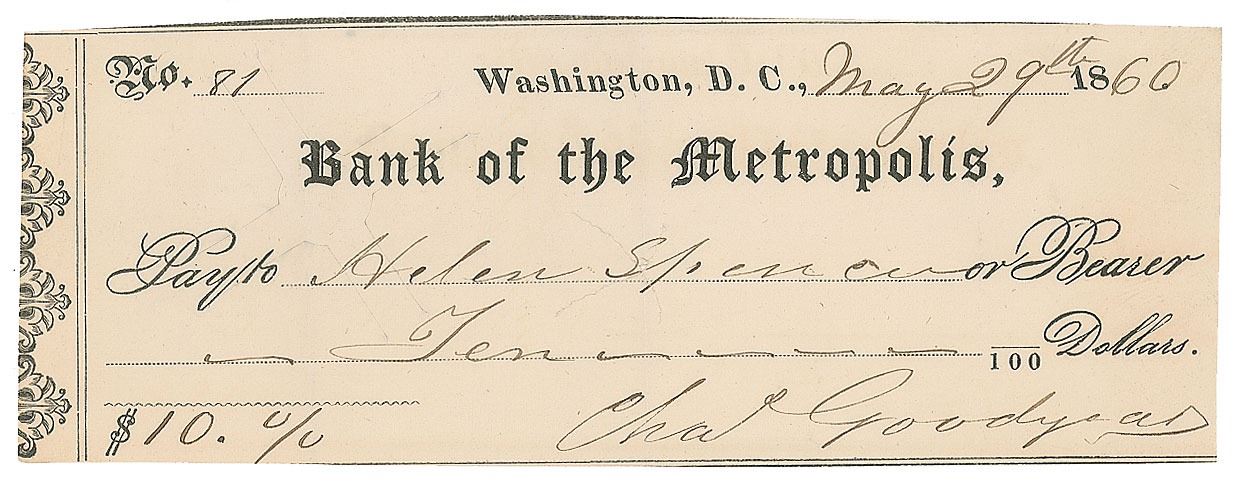 Bank of the Metropolis check, 6 x 2.25, filled out and signed by Goodyear, "Cha's Goodyear," payable to Helen Spencer for $10, May 29, 1860. In fine condition, with trimmed borders.