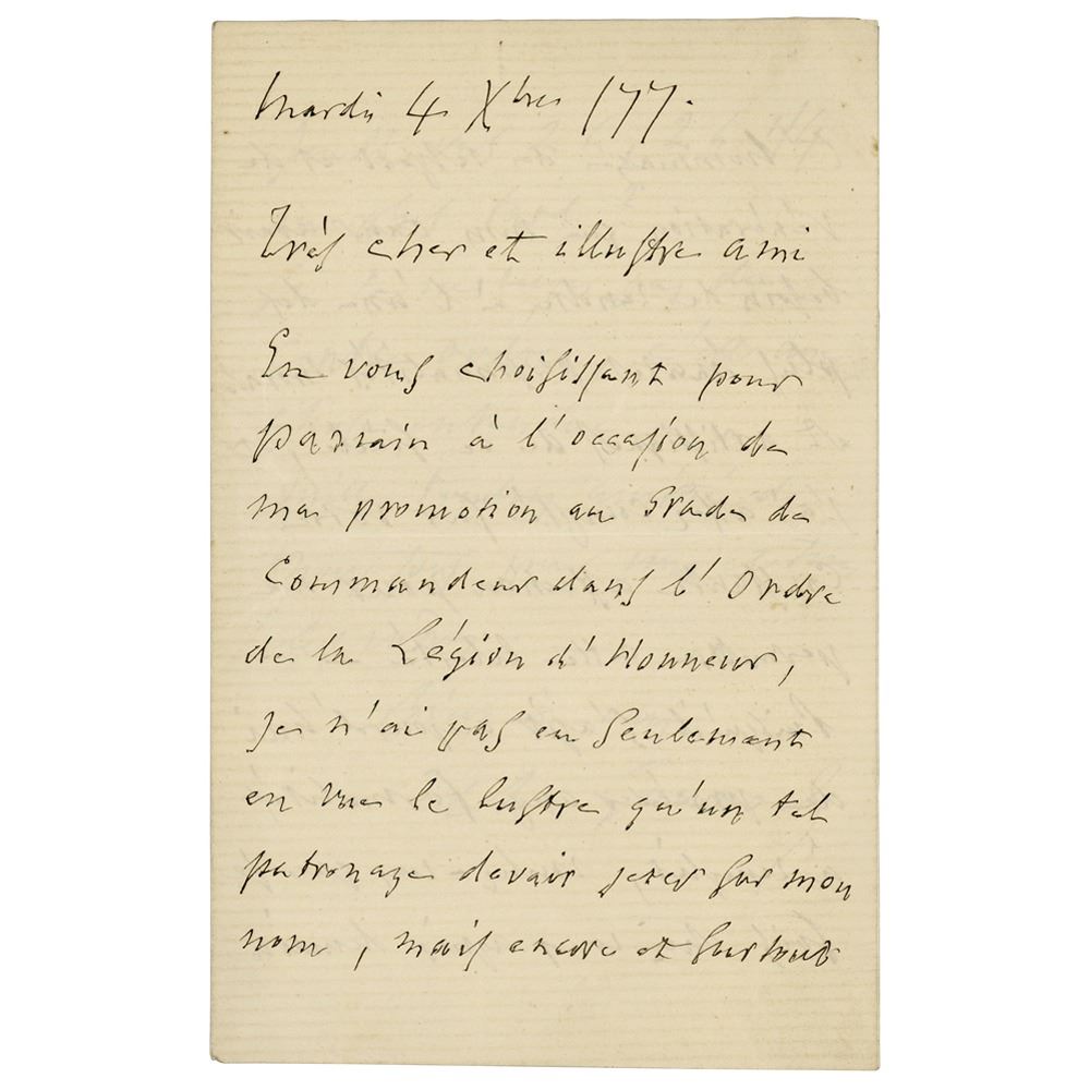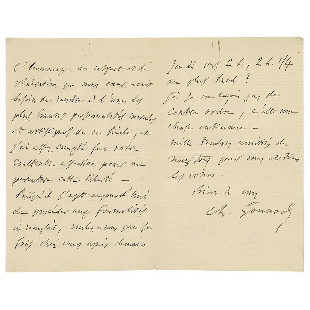 French composer (1818-1893) best remembered for his composition of 'Ave Maria.' ALS in French, signed “Ch. Gounod,” three pages on two adjoining sheets, 4.25 x 6.75, December 4, 1877. Untranslated handwritten letter accepting congratulations on his "promotion au grade de commandeur dans l'ordre de la Legion d'Honneur." In fine condition, with a rusty paperclip impression to the top.