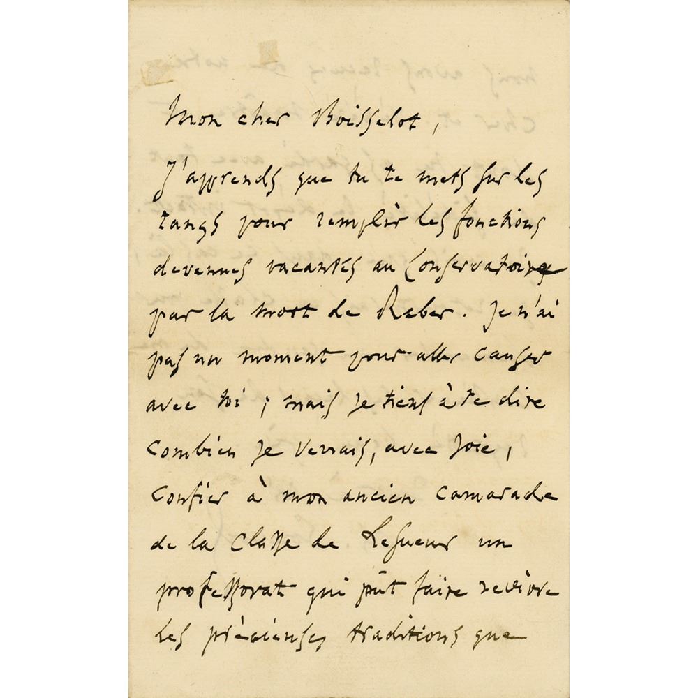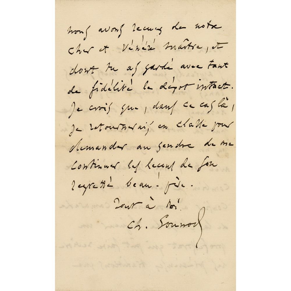 ALS in French, signed “Ch. Gounod,†two pages both sides, 4.5 x 7, no date. Untranslated handwritten letter to the French composer and musical-instrument manufacturer Xavier Boisselot. In fine condition. Accompanied by the original mailing envelope, addressed in Gounod's hand.