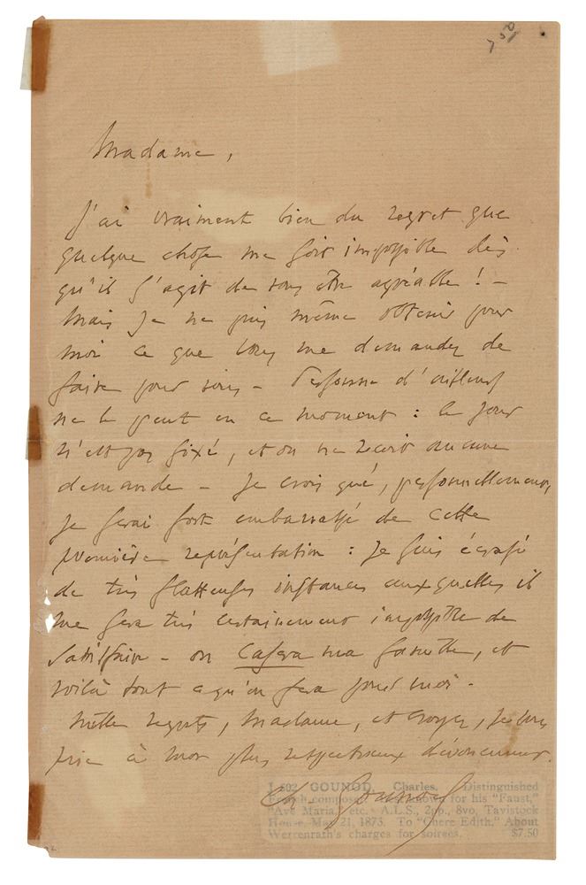 ALS in French, signed "Ch. Gounod," one onionskin page, 5.25 x 8.25, no date. Untranslated handwritten letter by the important French composer. In very good condition, with overall toning, a few small edge tears and losses, and toned tape remnants along the left edge.