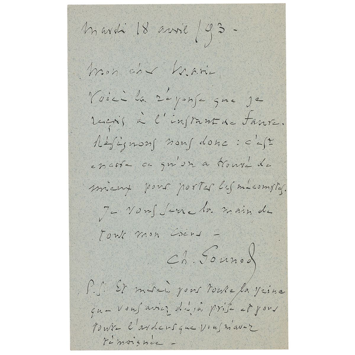 French composer (1818–1893) known for his opera, Faust, and for his composition of ‘Ave Marie.’ Beautifully penned ALS in French, signed “Ch. Gounod,” one page, 4.5 x 7. Untranslated letter to a female friend. In fine condition.