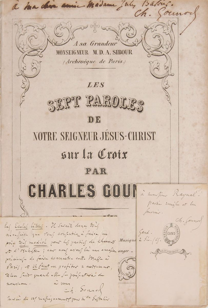 French composer (1818–1893) best remembered for his composition of ‘Ave Maria.’ Three items: a 2.25 x 4 carte-de-visite portrait of Gounod, signed and inscribed on the reverse in fountain pen; an ALS on both sides of a 4 x 3 card, October 18, 1884, concerning “the performance of the Paschal Mass”; and a sheet music booklet for ‘Les Sept Paroles de Notre Seigneur Jesus-Christ,’ signed and inscribed across the top by Gounod to “Madame Jules Barbier.” In overall very good to fine condition. Jules Barbier wrote the librettos for many of Gounod’s works, including Faust.