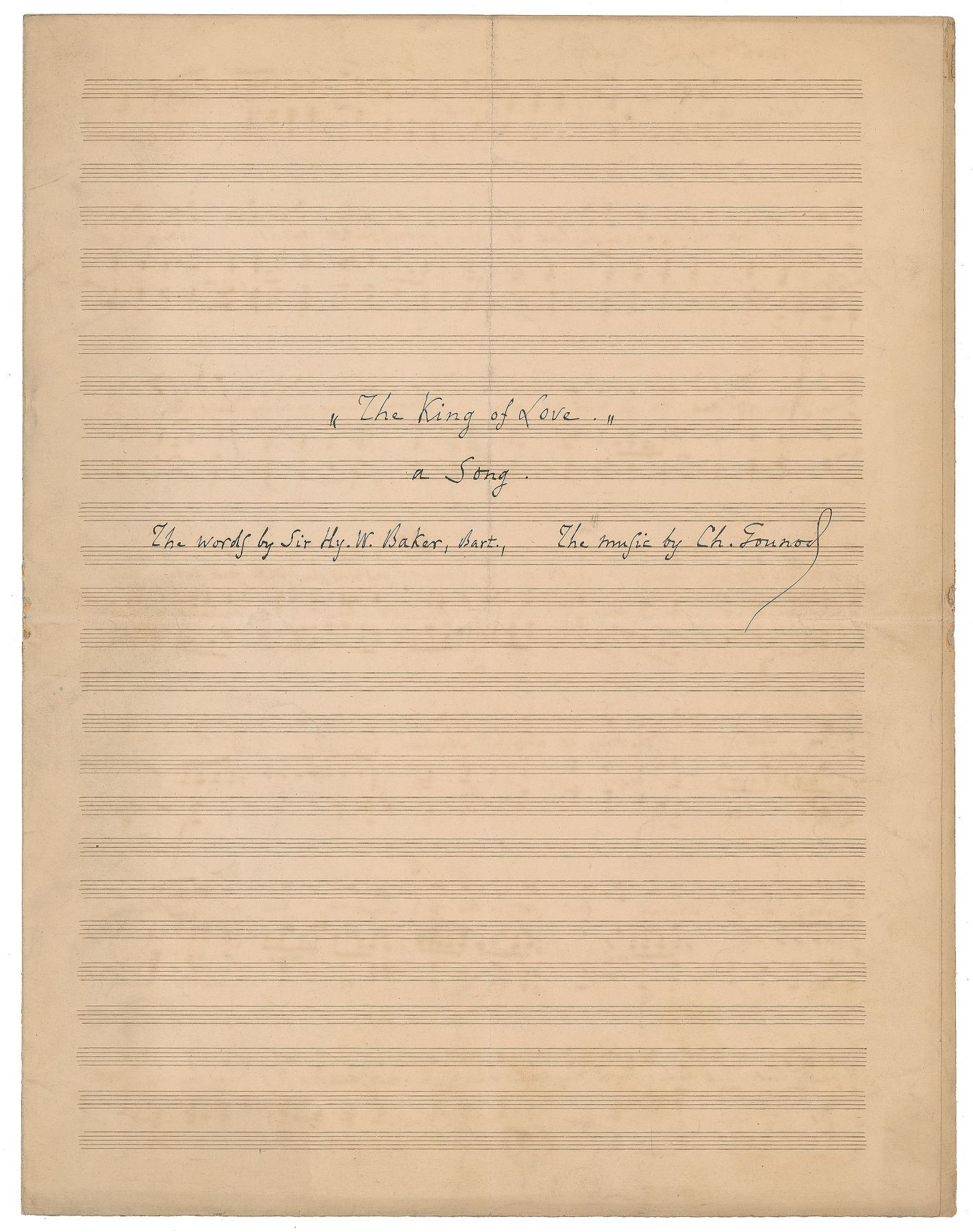 Outstanding autograph musical manuscript, two pages on two adjoining sheets, 10.5 x 13.75, titled and signed on the front in ink, "'The King of Love,' a Song. The words by Sir Hy. W. Baker, Bart., The music by Ch. Gounod." Gounod lengthily pens thirteen lines of music and lyrics to 'The King of Love.' In fine condition, with intersecting folds.