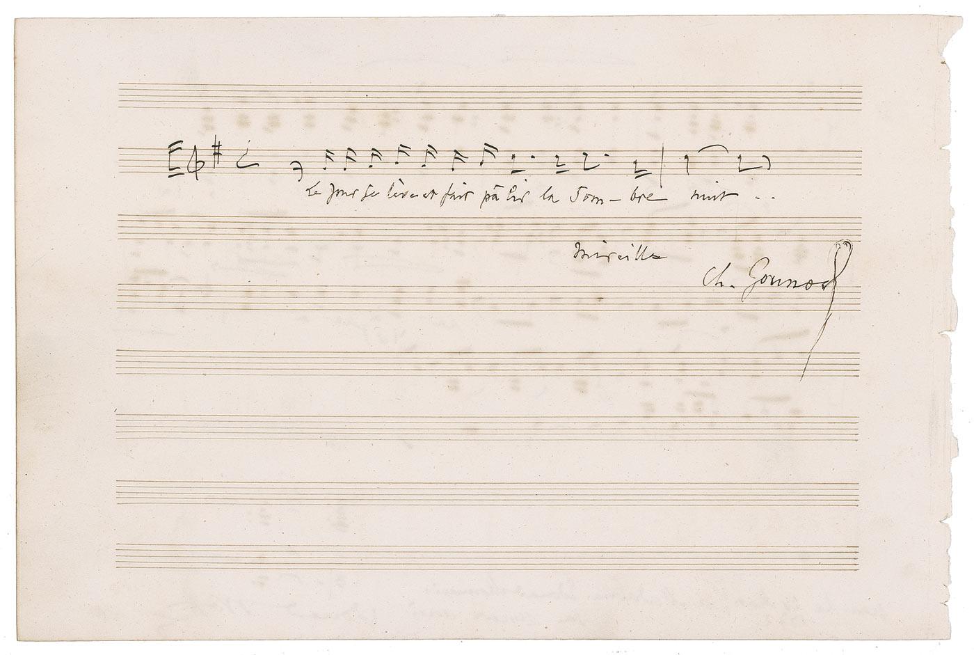 French composer who in 1859 joined the ranks of celebrated modern composers with his opera, Faust. AMQS on an off-white 10 x 6.75 musically lined page. Gounod pens two bars of music and lyrics from his opera Mireille. In fine condition, with a rough left edge and light show-through from another AMQS by another composer on reverse. RRAuction COA.