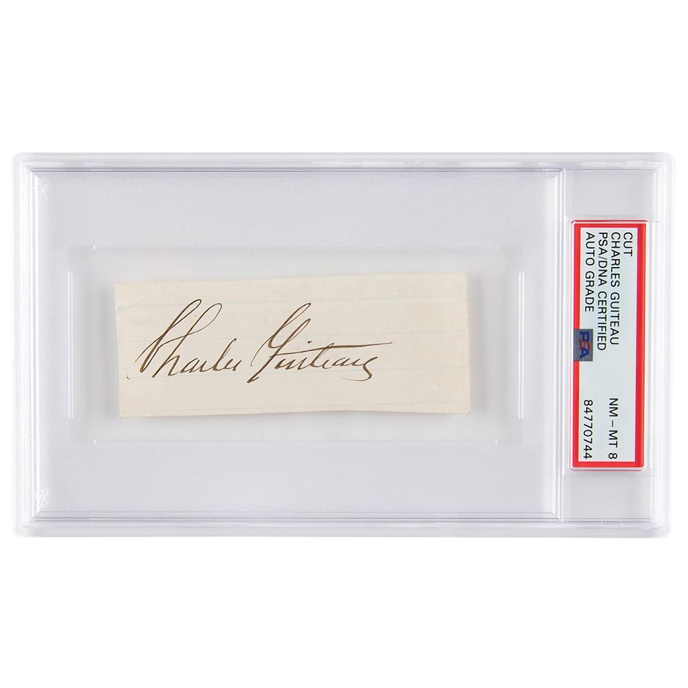 American lawyer (1841-1882) who, frustrated in his attempt to secure an ambassadorship, assassinated President James Garfield in 1881. Crisp ink signature, "Charles Guiteau,& rdquo; on an off-white 3.75 x 1.5 slip. In fine condition. Encapsulated and graded by PSA/DNA as "NM-MT 8."