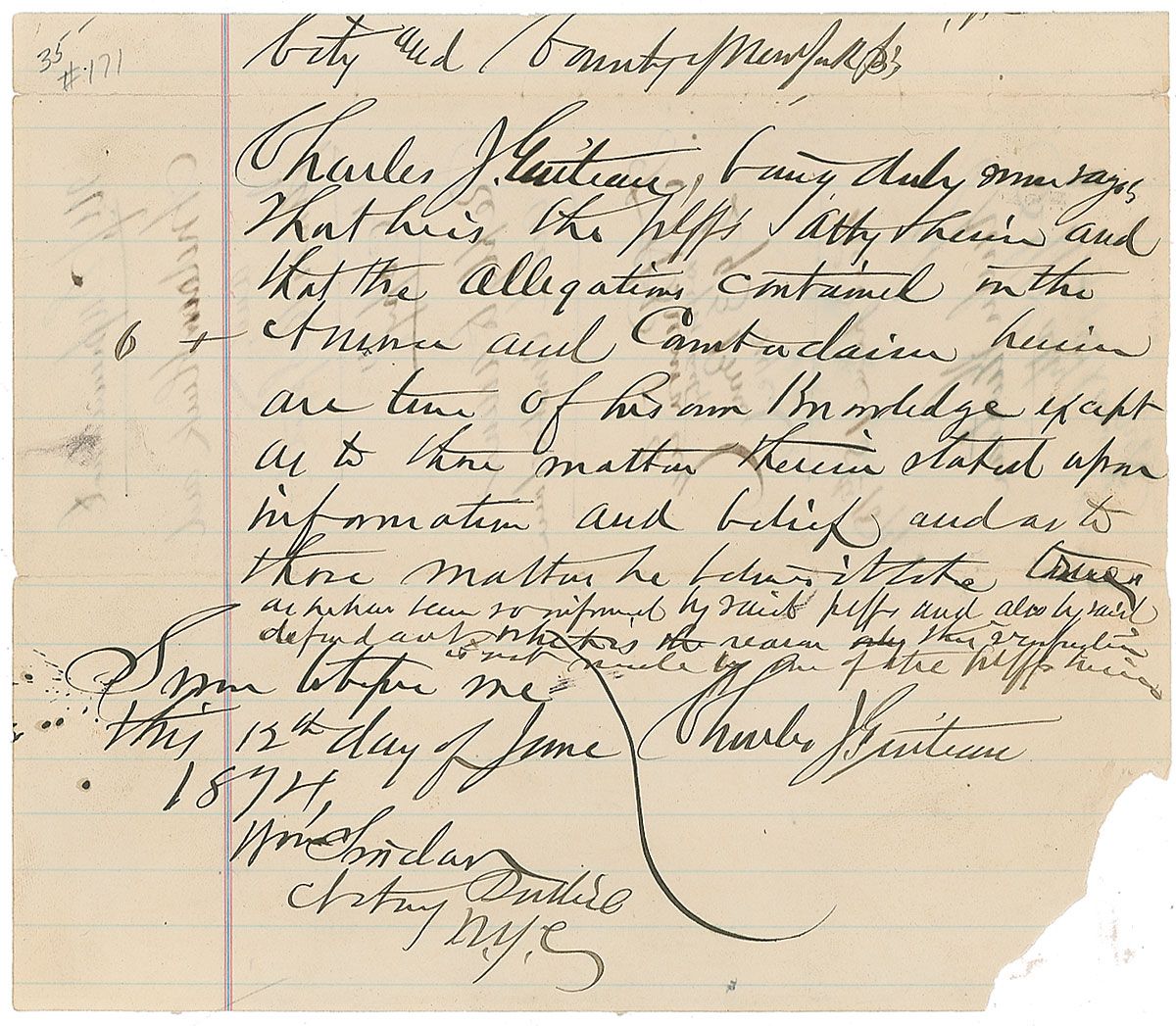 American lawyer (1841–1882) who, frustrated in his attempt to secure an ambassadorship, assassinated President James Garfield in 1881. Notarized ADS, signed “Charles J. Guiteau,” and signed additionally in the text and again on the docketing panel, one lightly-lined page, 8 x 7, June 12, 1874. Legal document, headed at the top, “City and/County of New York,” reads, in part: “Charles J. Guiteau…that his plffs atty herein and that the allegations contained in the…Counterclaim herein are true of his own knowledge except as to the matter therein stated upon information and belief and as to the matter …as he has been so informed by said plffs and also by mail defend as to what is the reason…is not made by one of the plffs.” Lower left bears an endorsement and signature of notary William Sinclair. Reverse bears a docketing panel in a unknown hand which states “NY Supreme Court, Andrew Gluck and James K. Spratt ‘Copy’ Reply to answer and counterclaim…Red’d June 15th, 1874,” and is signed at the bottom, “Charles J. Guiteau Plffs Atty.” Small separation to one horizontal fold, paper loss to lower right corner, affecting nothing, and some light show-through from docketing on reverse, otherwise fine condition.