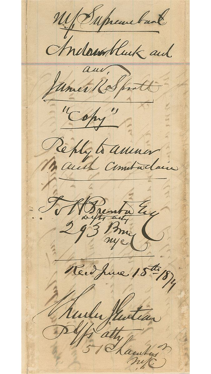 Unable to hold a job and struggling financially, Charles Guiteau moved from Illinois to New York and back again multiple times during the 1860s and 70s. After failing in his attempt at running a small legal firm in Chicago, angering clients with his outrageous fees and mediocre service, he and his wife moved to New York in 1874. Hoping to secure a job in the newspaper business but finding no open positions upon his arrival, he unhappily returned to law; this document, signed as a plaintiff’s attorney, marks one of his last legitimate positions. When his wife divorced him that same year, Guiteau grew increasingly despondent and erratic, shifting his focus from law to religion to politics, eventually deciding that he should receive an appointment in Washington, DC. When that appointment never came, the disgruntled office-seeker set out to assassinate newly elected President Garfield, firing the fatal shot in July of 1881. An interesting document from the tumultuous final years of a man in decline.