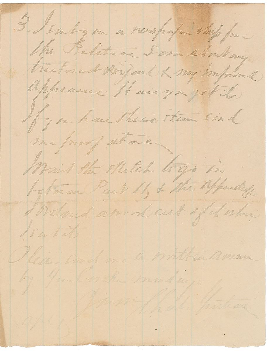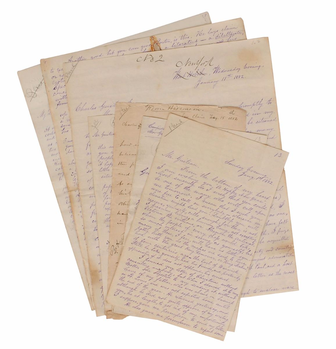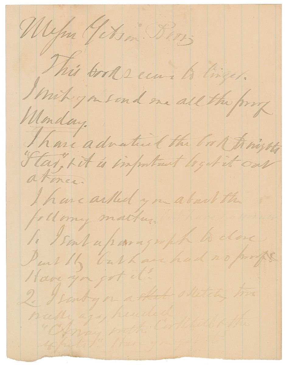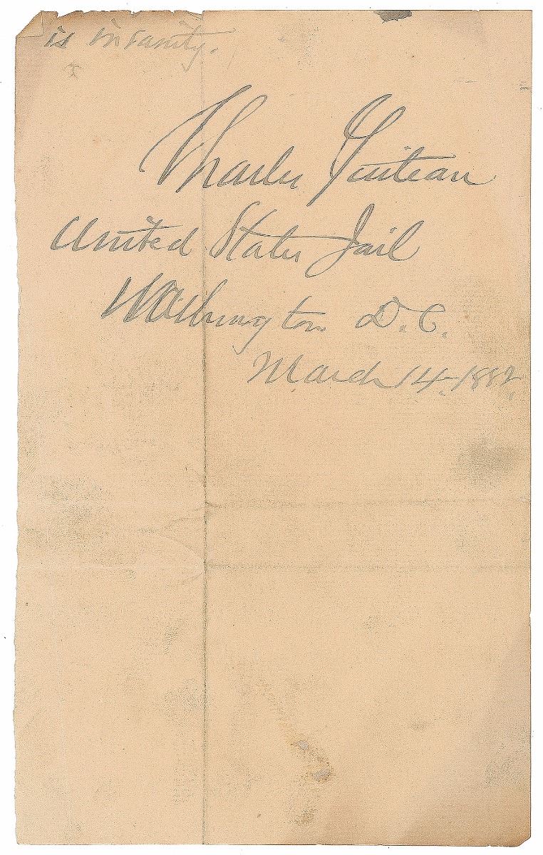 Remarkable archive related to the publication of Guiteau’s 1882 book The Truth and The Removal, consisting of an ALS by Guiteau, seven pages from the manuscript in his hand, and six letters written to Guiteau by admirers after the assassination. The two-page ALS is addressed to the printer, “Gibson Bros.,” no date but circa March 1882, in part: “This book seems to linger. I wish you send me all the proof Monday. I have advertised the book [in] to nights 'Star,' & it is important to get it out at once. I have asked you about the following matter. 1. I sent a paragraph to close Part II, but have had no proof. Have you got it? 2. I sent you a sketch, two months ago, headed 'Away with Corkhill & the experts' Have you got it? 3. I sent you a newspaper slip from the Baltimore Sun about my treatment in jail & my improved appearance. Have you got it. If you have these items send me proof at me. I want the sketch to go in between Part II, & the Appendix. I ordered a word cut of it when I sent it. Please send me a written answer.”