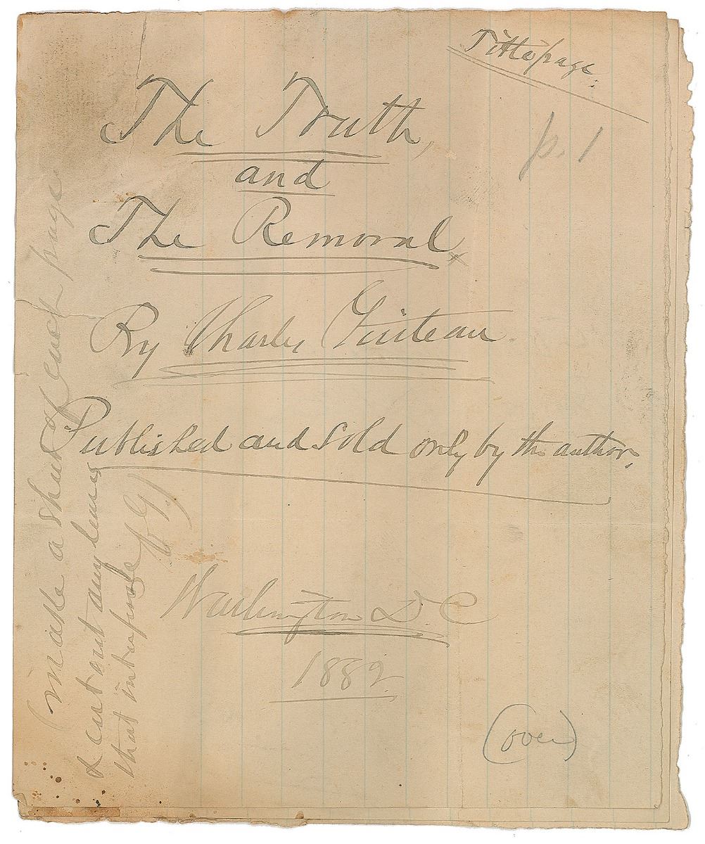 Next is a three-sheet booklet assembled by Guiteau as a layout guide for the opening pages of the book, the first being a title page reading: “The Truth and The Removal By Charles Guiteau, Published and sold only by the author. Washington, D.C., 1882,” with a note in the margin, “Make a sheet of each page & cut out any leaves that interpose. C. G.” The reverse is signed again, “Copyright 1882, By Charles Guiteau.” On the next page Guiteau has simply written “Part I,” followed by the last page which reads, “The Truth: A Companion to the Bible.” Guiteau then adds a parenthetical instruction, “To the printer, (Copy preface on the next page and then the entire book, The Truth),” referring to his 1879 volume. An additional leaf bears the last two words of the preface, “is insanity,” followed by Guiteau’s signature, “Charles Guiteau, United States Jail, Washington D.C., March 14, 1882.”