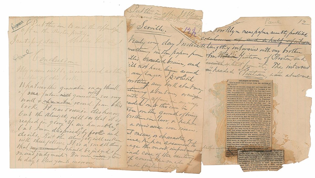 Three other fragments from the autograph manuscript are present, including two paragraphs of the “Conclusion,” a deleted passage berating his court-appointed attorney George Scoville, and a page bearing an affixed newspaper clipping. The conclusion, in part: “Whatever this generation may think of me, future generations will see my work & character record from this book. It was sown in dishonor but the Almighty will see that it is reaped in glory. 'Ye are honorable, but I am despised’—by fools and devils…Life is a flimsy dream & it matters little when one goes. Paradise is a great improvement on this sin cursed world & I shall be far better off there than here.” The balance of the archive features six letters from Guiteau's admirers, many of which were published in The Removal. On all of the letters, Guiteau had crossed out certain sections for the benefit of the printer. In overall very good to fine condition. From the family of printer William Gibson, whose firm printed the book in 1882.