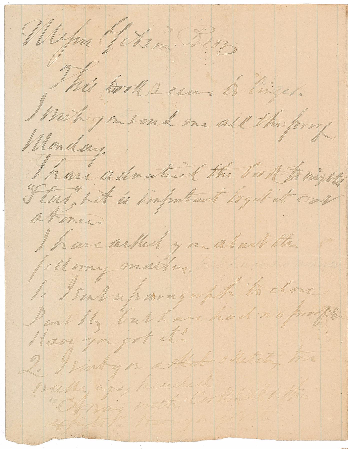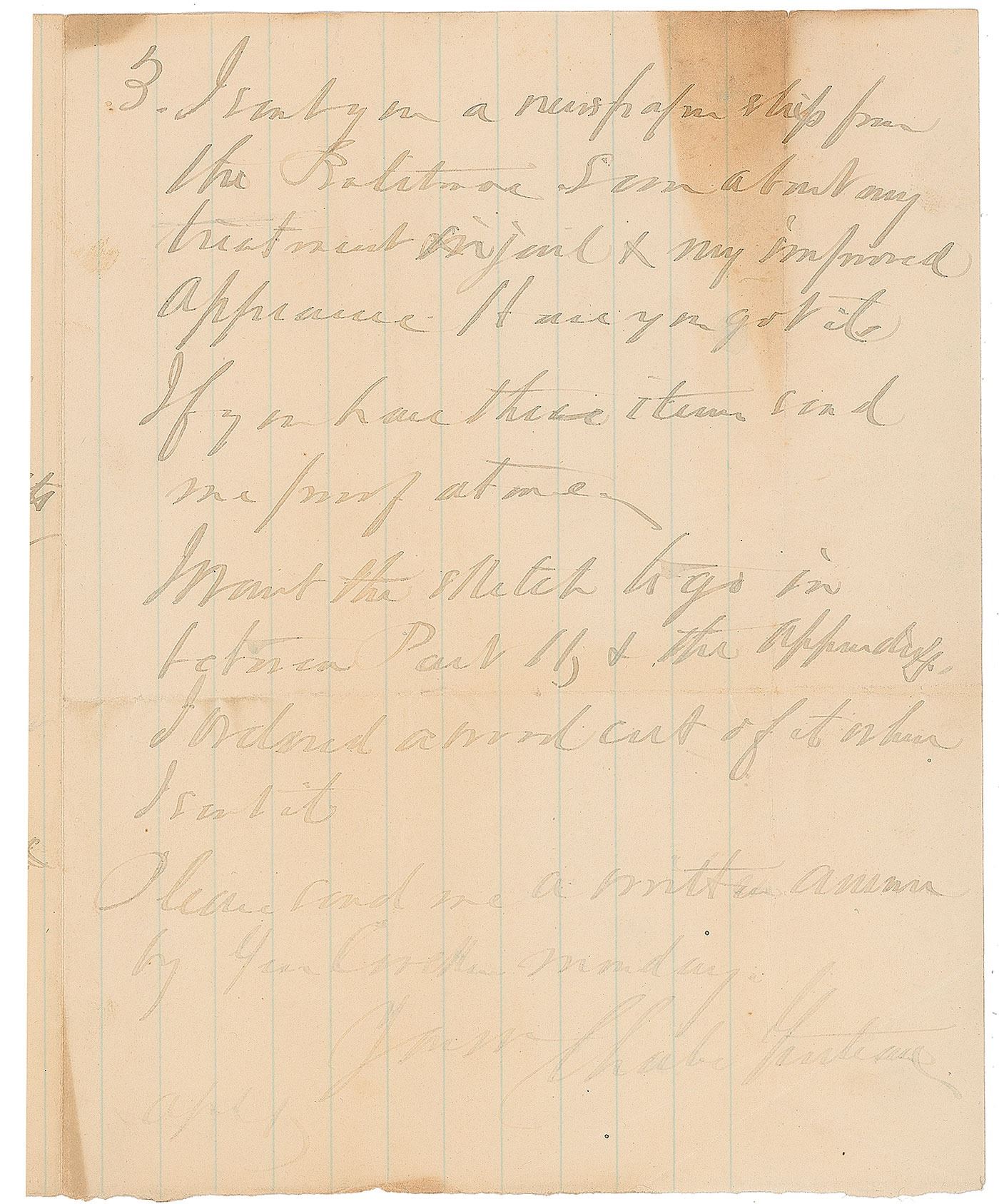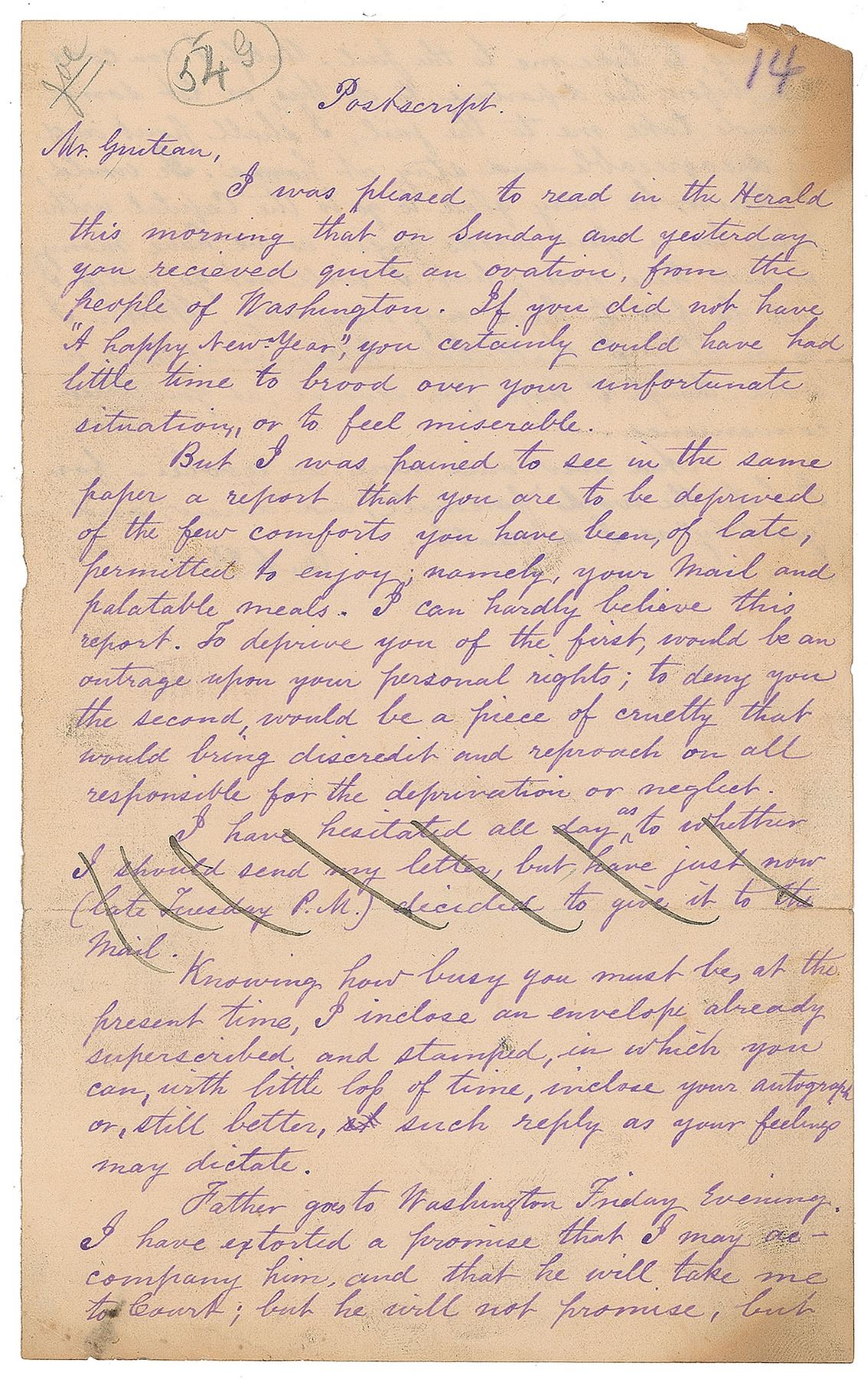 Rare ALS, two pages on two adjoining sheets, lightly lined, 6.25 x 8, 1882. Letter to the Gibson Brothers Publishing Company, in part: "This book seems to linger. I wish you send me all the proof Monday. I have advertised the book to nights 'Star,' & it is important to get it out at once. I have asked you about the following matter. 1. I sent a paragraph to close Part II, but have had no proof. Have you got it? 2. I sent you a sketch, two months ago, headed 'Away with Corkhill & the experts.' Have you got it? 3. I sent you a newspaper slip from the Baltimore Sun about my treatment in jail & my improved appearance. Have you got it. If you have these items send me proof at me. I want the sketch to go in between Part II, & the Appendix. I ordered a word cut of it when I sent it. Please send me a written answer by…Monday." In very good condition, with light creasing and toning, and portions of the text (and the entire signature) quite light but fully legible. Accompanied by a letter addressed to Guiteau by an admirer Clara Augusta Davis, who hopes to visit the prisoner, in part: "Father goes to Washington Friday Evening. I have extorted a promise that I may accompany him, and that he will take me to Court; but he will not promise, but refuses, to take me to the jail. Unless I can coax him, before his departure, to do this, or let some friends take me to the jail, I shall pout and be disagreeable—and stay at home." Guiteau was found guilty of the murder of President James A. Garfield and sentenced to hang on June 30, 1882. While awaiting execution, Guiteau composed The Removal, a sequel to his 1879 religious tract, The Truth, a Companion to the Bible. The condemned prisoner employed Gibson Brothers of Washington to print the book as The Truth and The Removal.