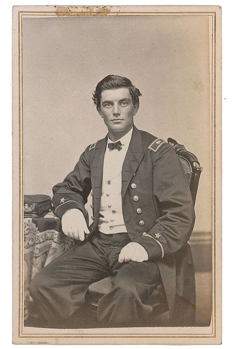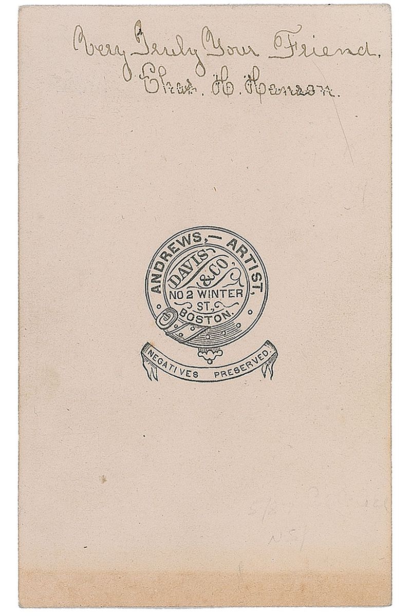 Acting ensign in the Union navy, honorably discharged in November 1865. Original 2.5 x 4 carte-de-visite portrait of Hanson in uniform, signed on the reverse in black ink, “Very truly your friend, Chas. H. Hanson.” Published by Davis & Co. of Boston. In fine condition, with a bit of soiling to top edge.