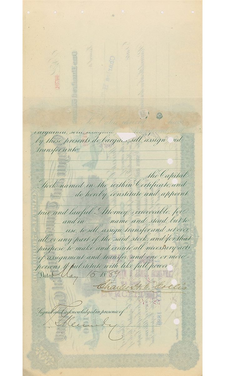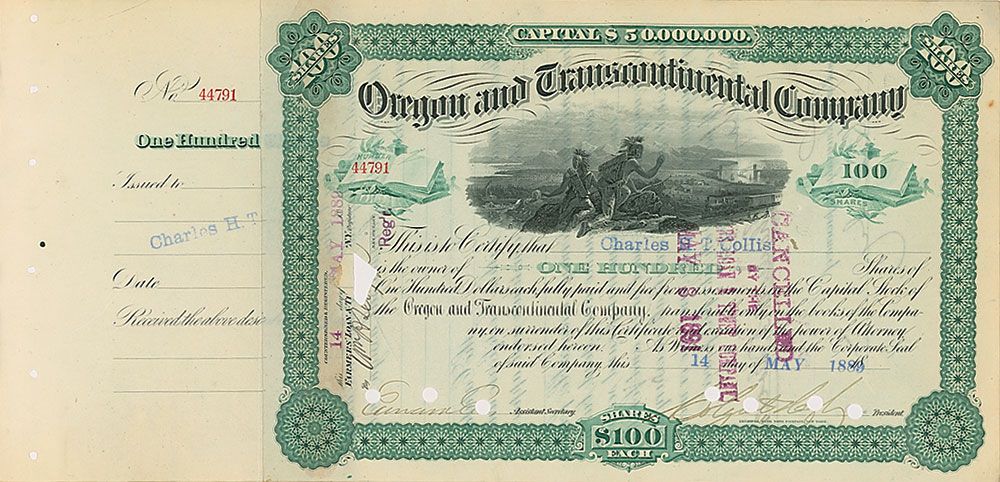 Irish-American US Army officer who received the Medal of Honor for his actions in the Civil War (1838–1902). Partly-printed DS, one page, 10.75 x 7, May 14, 1889. Stock certificate for 100 shares of the Oregon and Transcontinental Company, signed on the reverse by Collis to transfer his shares to another gentleman. A stock transfer slip is also affixed to the reverse. In fine condition, with expected cancellation stamps and holes (one hole affecting the top of a single letter in his signature). Accompanied by an indenture for a purchase of land by Collis, signed by the seller only.
