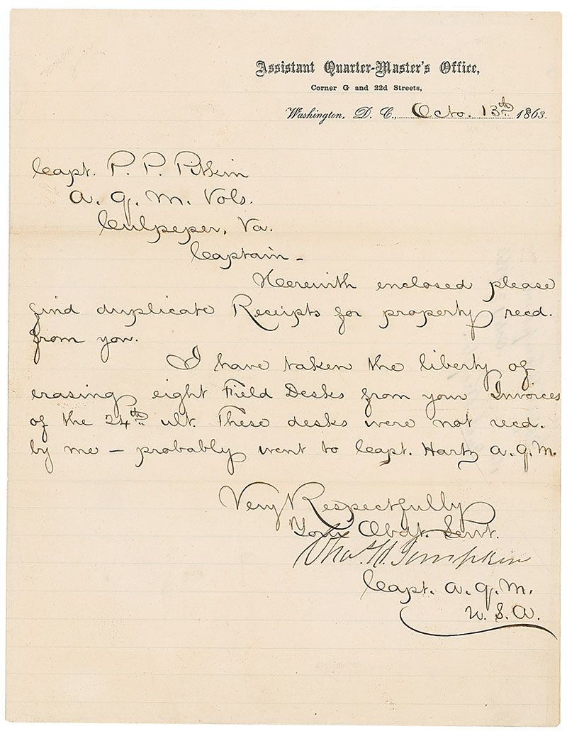Union officer (1830–1915) who was the first Union officer to be awarded the Congressional Medal of Honor for valor in action at the Battle of Fairfax Court House, although he was not awarded the medal until 1893. War-dated LS signed “Cha. H. Tompkins,” one page, lightly-lined, 7.75 x 10, Assistant Quarter-Master’s Office letterhead, October 13, 1863. Letter to Captain P. P. Pitkin. In part: “I have taken the liberty of erasing eight Field Desks from your Invoices of the 24th ult. These desks were not rec’d by me—probably went to Capt. Hartz A. Q. M.” Letter has been inlaid to a slightly larger off-white sheet. In fine condition.