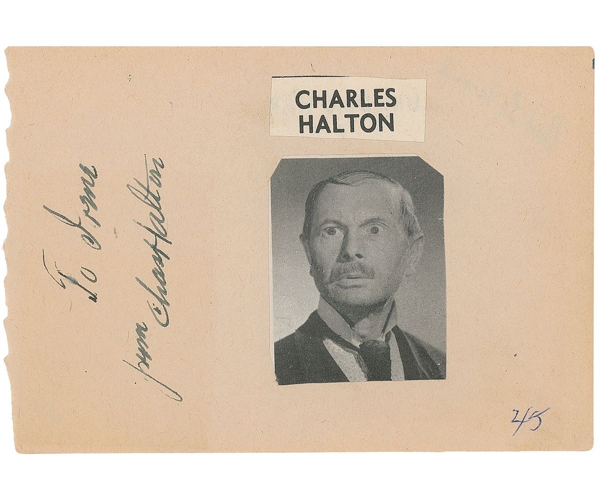Actor (1876-1959) who appeared in over 180 films over five decades, best remembered as Carter, the bank examiner in It’s a Wonderful Life. Vintage fountain pen signature and inscription, “To Irene, from Chas Halton,” on an off-white 6 x 4 album page with affixed label and magazine photo. In fine condition, with slight feathering to inscription and signature, scattered mild toning, and light show-through from Bob LeMond signature on reverse.