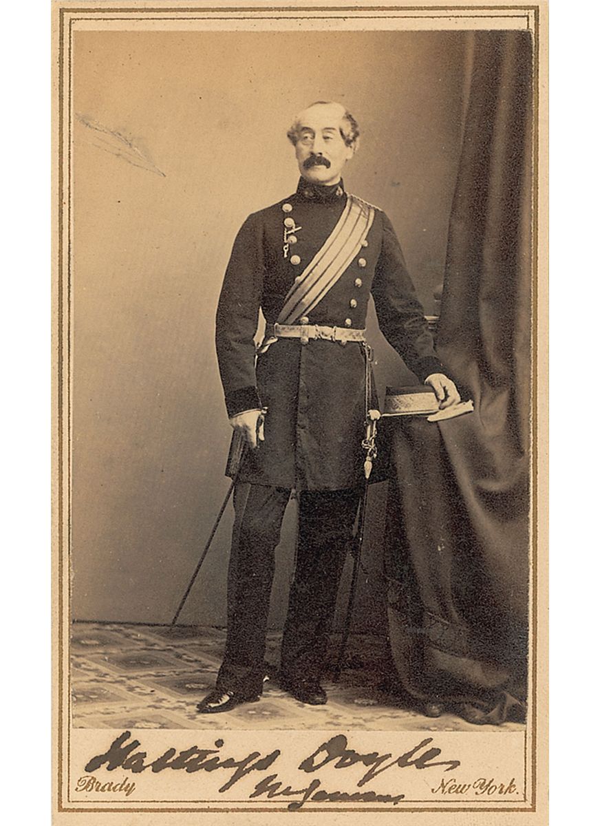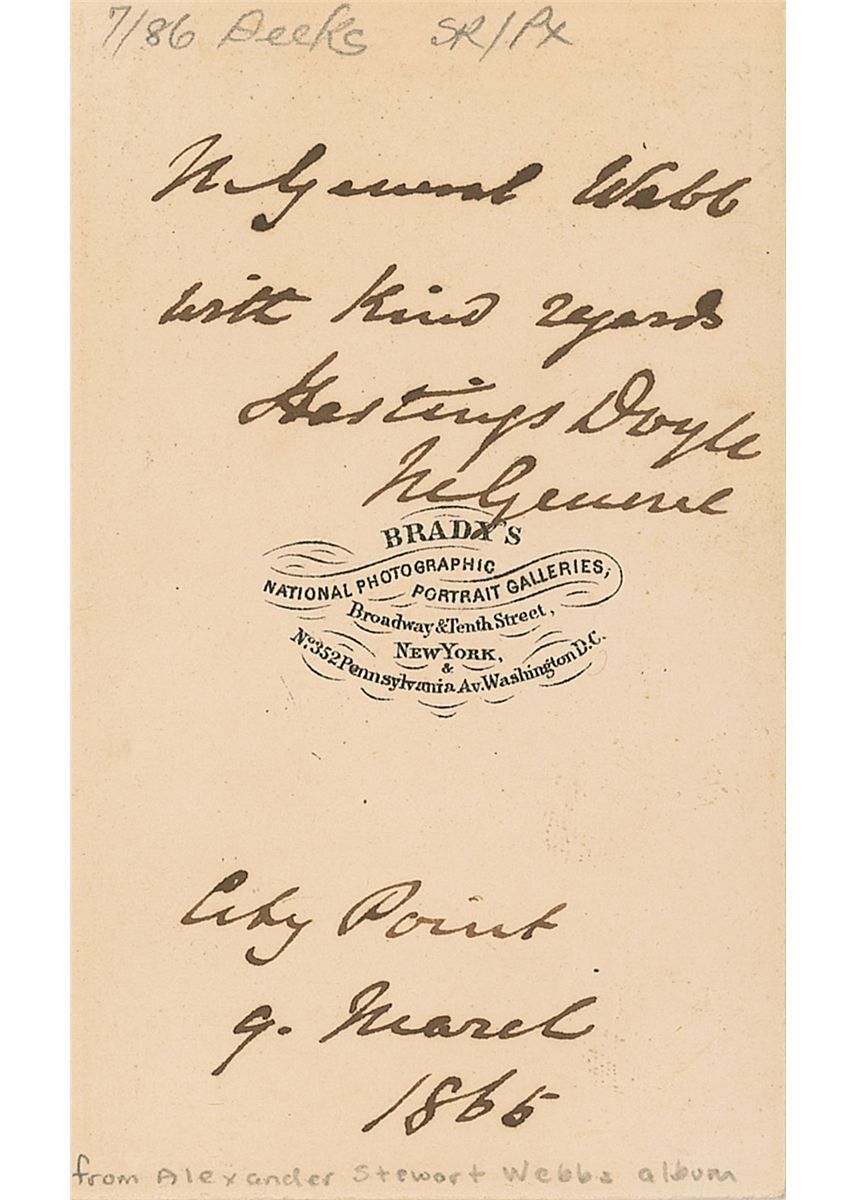 British military officer (1804–1883) and the second Lieutenant Governor of Nova Scotia. Original 2.25 x 4 full-length carte-de-visite photo by Brady’s of New York, signed in the lower border in black ink, “Hastings Doyle, M General,” and signed and inscribed on the reverse “To General Webb, with kind regards Hastings Doyle, M General, City Point, 9 March 1865.” In fine condition, with some light surface and silvering marks to image, and pencil notations to reverse.