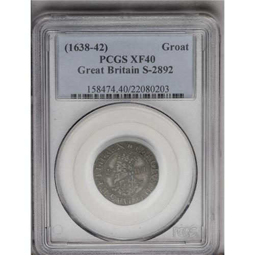 <B>Charles I (1625-1649) Aberystwyth groat. </B></I>S-2892. XF40 PCGS. Open Book mm. Struck 1638-1642. Most pleasing, with even medium gray toning, sharp details in all areas, and centered on a full flan. Ex Spink's Gartner & Richmond sale, #14, lot 1804.