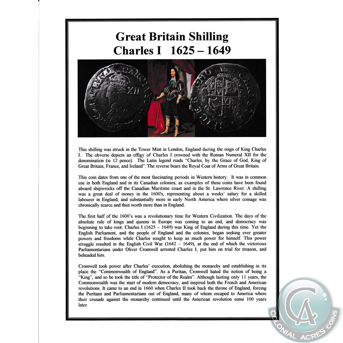 Charles I 1625-1649 Great Britain Shilling with Informational display card
