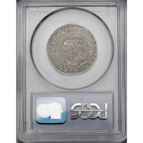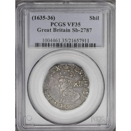 <B>Charles I (1625-1649) shilling. </B></I>S-2791 (slab notes S-2787 in error). VF35 PCGS. Tower Mint under the king. Crown mm, struck 1635-1636. Pleasant Very Fine, eye-catching two-tone gray toning, good detail in the portrait with the falling lace collar.