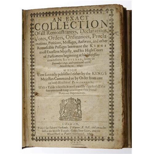 <B>Charles I: <I>An Exact Collection of All Remonstrances, Declarations</B></I></B></I> <I>...between the Kings Most Excellent Majesty and His High Court of Parliament...</B></I> also known as <I>Husband's Collection</B></I> (London: printed for Edward Husbands, T. Warren, R. Best, 1642/3), first edition, 955 pages, table of contents, contemporary blindstamped calf, spine rebacked with new endpapers, 12mo (6" x 7.5"). Good condition, pages lightly foxed, general cover wear. From the Henry E. Luhrs Collection.